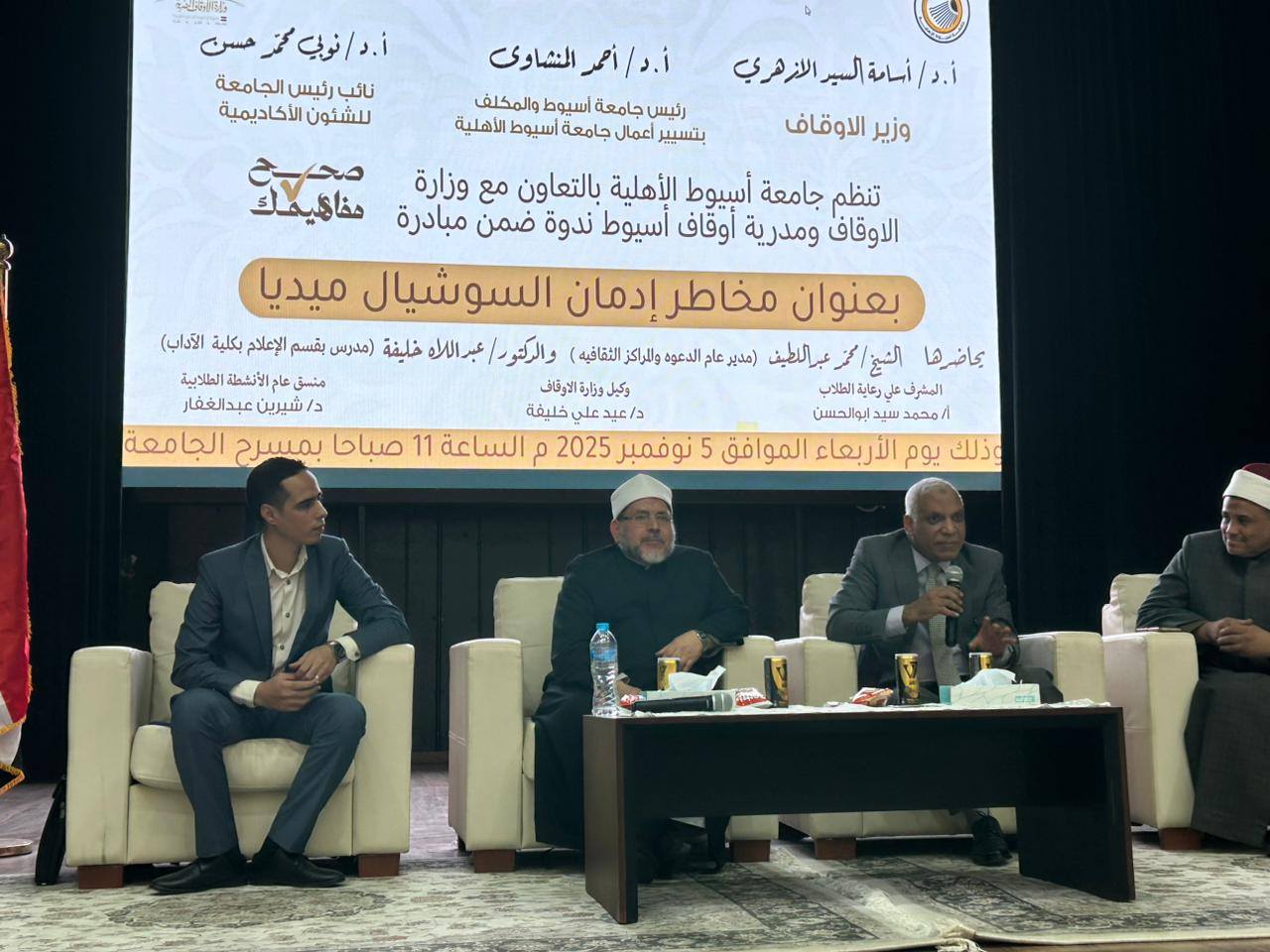 نظّمت مديرية أوقاف أسيوط، بالتعاون مع جامعة أسيوط الأهلية، ندوة تثقيفية بعنوان: «مخاطر إدمان السوشيال ميديا»، ضمن فعاليات مبادرة «صحح مفاهيمك»، التي تهدف إلى تعزيز الوعي الديني والفكري بين فئات المجتمع، خاصة الشباب، برعاية الدكتور أسامة الأزهري، وزير الأوقاف، والدكتور أحمد المنشاوي، رئيس جامعة أسيوط والمكلف بتسيير أعمال جامعة أسيوط الأهلية، وإشراف الدكتور عيد علي خليفة، مدير المديرية، وبحضور قيادات الأوقاف وأعضاء هيئة التدريس وطلاب الجامعة.