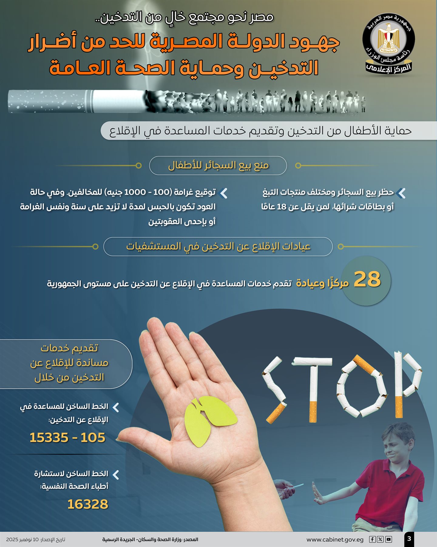 نشر المركز الإعلامي لمجلس الوزراء عددًا من الإنفوجرافات عبر منصاته على مواقع التواصل الاجتماعي، سلط من خلالها الضوء على جهود الدولة للحد من أضرار التدخين وحماية الصحة العامة.