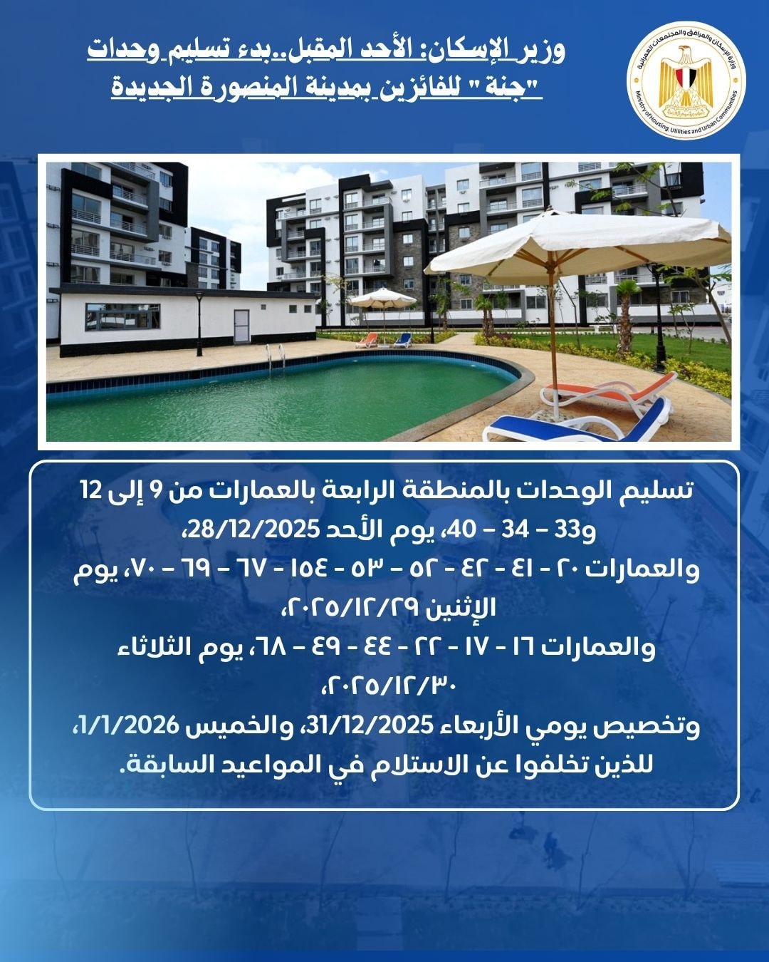 ونوَّه رئيس الجهاز عن أنه سيتم تسليم الوحدات بالمنطقة الرابعة بالعمارات من 9 إلى 12 و33 – 34 – 40، يوم الأحد 28/12/2025، والعمارات ٢٠ - ٤١ - ٤٢ - ٥٢ – ٥٣ - ١٥٤ - ٦٧ – ٦٩ – ٧٠، يوم الإثنين ٢٠٢٥/١٢/٢٩، والعمارات ١٦ - ١٧ - ٢٢ - ٤٤ - ٤٩ – ٦٨، يوم الثلاثاء ٢٠٢٥/١٢/٣٠، وتخصيص يومي الأربعاء 31/12/2025، والخميس 1/1/2026، للذين تخلفوا عن الاستلام في المواعيد السابقة.