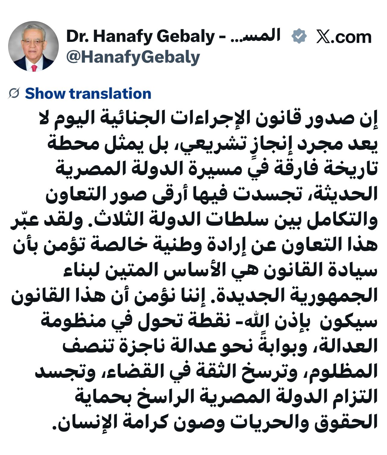 وقال جبالي : إن صدور قانون الإجراءات الجنائية اليوم لا يعد مجرد إنجازٍ تشريعي، بل يمثل محطة تاريخة فارقة في مسيرة الدولة المصرية الحديثة، تجسدت فيها أرقى صور التعاون والتكامل بين سلطات الدولة الثلاث.