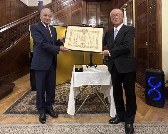 من جانبه، عبّر أحمد أبو الغيط عن امتنانه لهذا التكريم، مؤكدًا اعتزازه بعلاقاته الممتدة مع اليابان، ومشددًا على أهمية مواصلة العمل لتعزيز التعاون الياباني – المصري والياباني – العربي في مختلف المجالات.