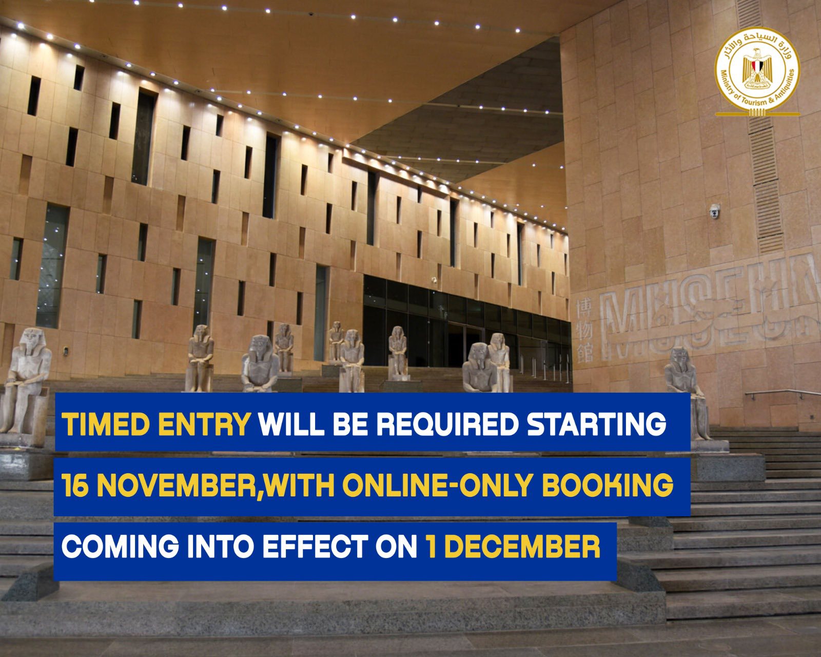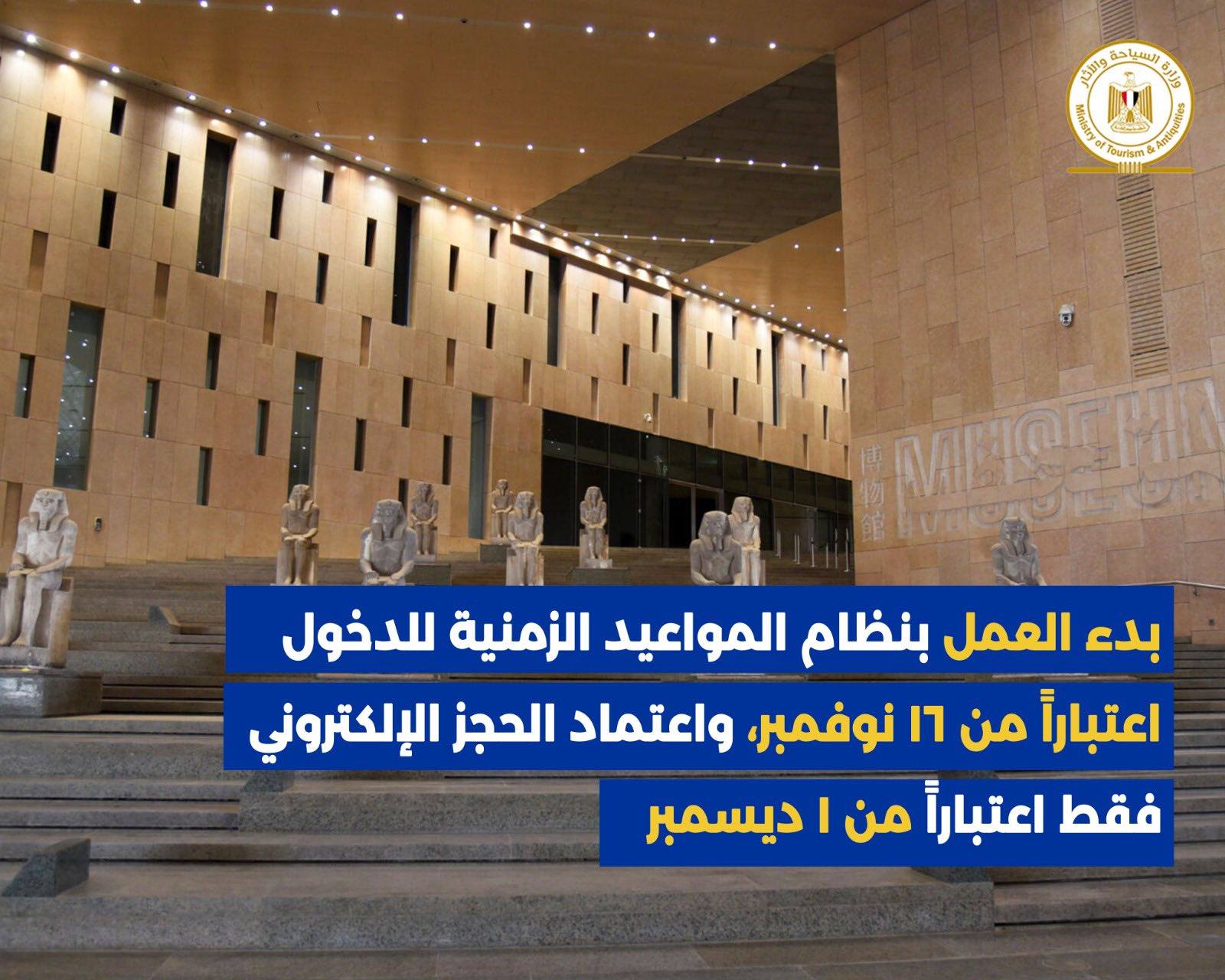 قررت إدارة المتحف المصري الكبير بدء العمل بنظام الحجز المسبق وفق مواعيد زمنية محددة لتذاكر الدخول، وذلك اعتبارًا من يوم الأحد الموافق 16 نوفمبر الجاري.
