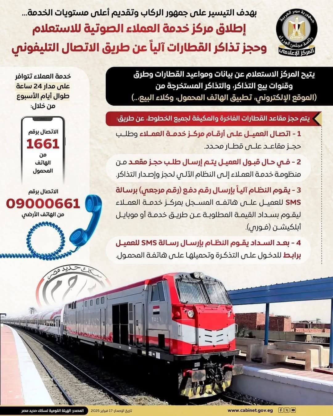 في إطار التيسير على جمهور الركاب وتقديم أعلى مستويات الخدمة لهم، أطلقت الهيئة القومية لسكك حديد مصر وشركاتها التابعة مركز خدمة العملاء الصوتي الجديد، ليُمثل خطوة نوعية نحو التحول الرقمي وتسهيل خدماتها المقدمة لجمهور الركاب.