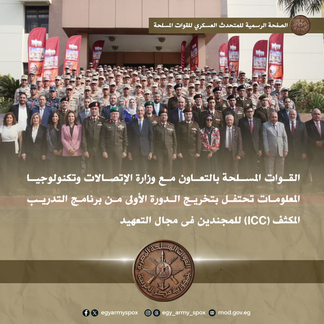 احتفلت القوات المسلحة بالتعاون مع وزارة الإتصالات وتكنولوجيا المعلومات بتخريج الدورة الأولى من برنامج التدريب المكثف (ICC) والتى نظمت بمعهد نظم المعلومات للقوات المسلحة لمدة (4) أشهر لصالح خريجى كليات الهندسة تخصص (حاسبات) وكليات الحاسبات والمعلومات من المجندين الموجودين بالقوات المسلحة.