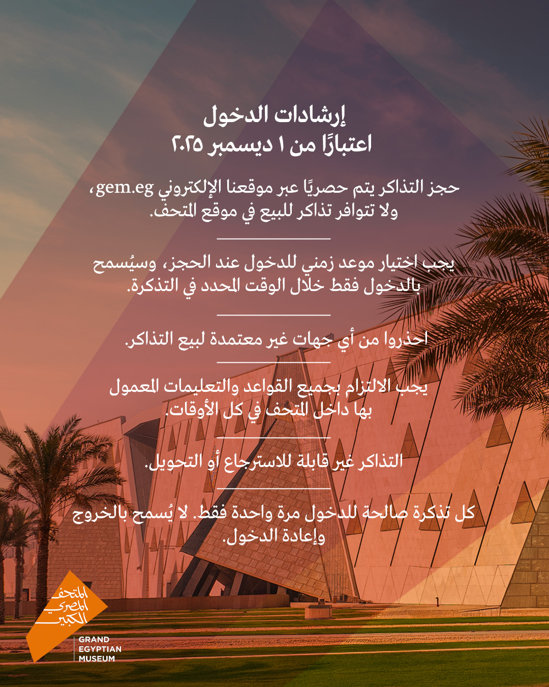 ودعت إدارة المتحف المصري الكبير التزام الزائرين بالمواعيد الزمنية الواردة في تذاكر الزيارة الخاصة بهم، مع إتاحة إمكانية الحجز والاطلاع على المواعيد المتوفرة عبر الموقع الرسمي للمتحف: www.gem.eg.