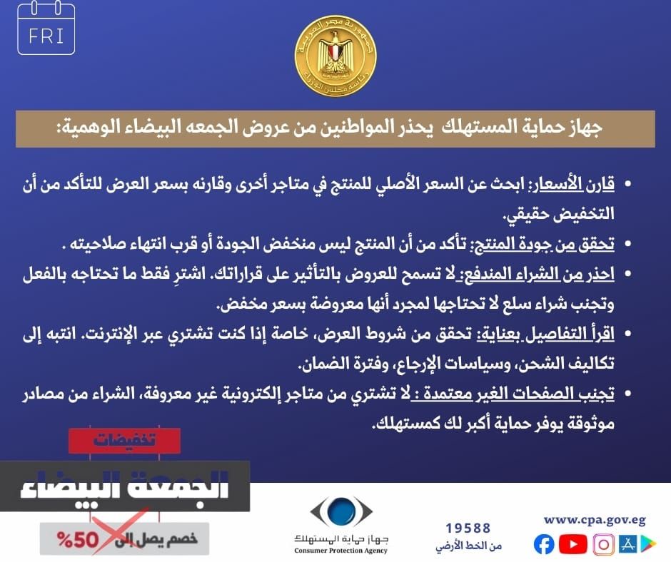 يُجدد جهاز حماية المستهلك دعوته للمواطنين بضرورة توخي الحذر عند التعامل مع عروض التخفيضات والمشتريات، سواء عبر المنصات الإلكترونية أو داخل المحال التجارية؛ حفاظًا على حقوقهم وضمانًا لشفافية المعاملات خلال موسم «الجمعة البيضاء».