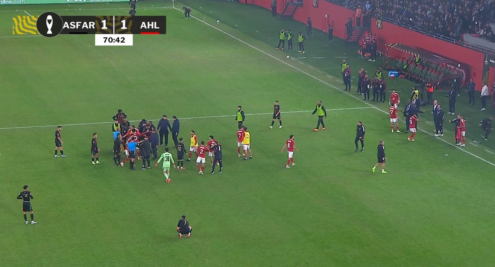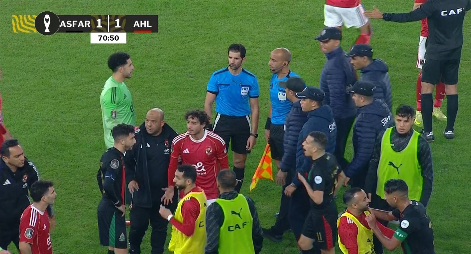 شهدت المباراة بين الأهلي والجيش الملكي المغربي حالة من التوتر بعد احتكاكات محدودة بين لاعبي الفريقين في اللقاء الذي يجمع الفريقين ضمن الجولة الثانية من دور المجموعات لدوري أبطال إفريقيا.