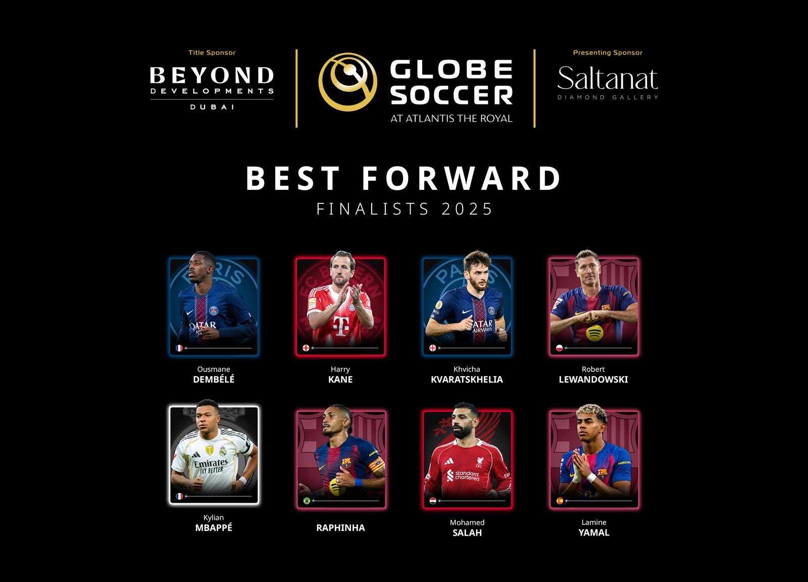 محمد صلاح (ليفربول) – عثمان ديمبلي (باريس سان جيرمان) – هاري كين (بايرن ميونخ) – كيليان مبابي (ريال مدريد) – خفيتشا كفارتسخيليا (باريس سان جيرمان) – روبرت ليفاندوفسكي – رافينيا – لامين يامال (برشلونة).