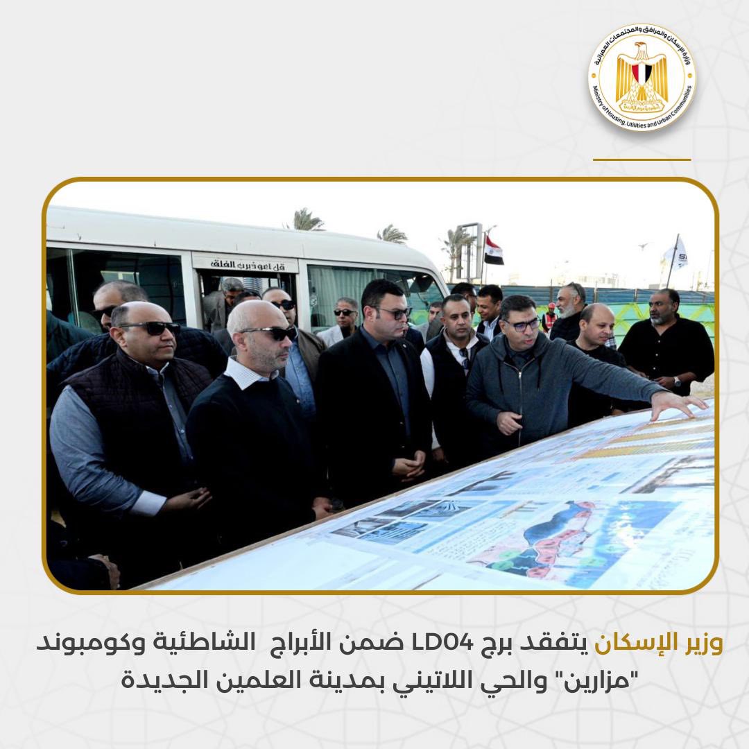 وزير الإسكان يتفقد الأبراج الشاطئية وكومبوند «مزارين» والحي اللاتيني بالعلمين الجديدة