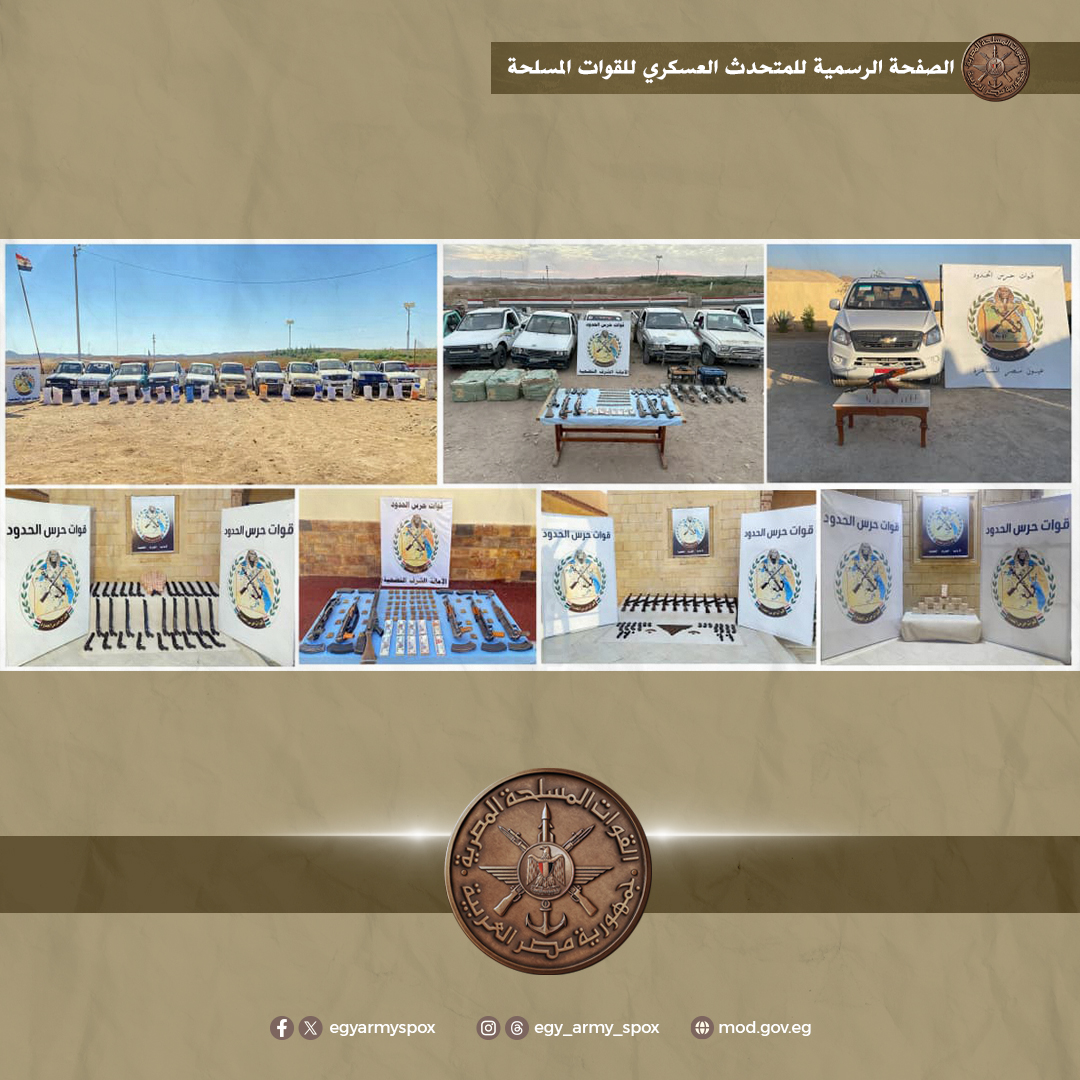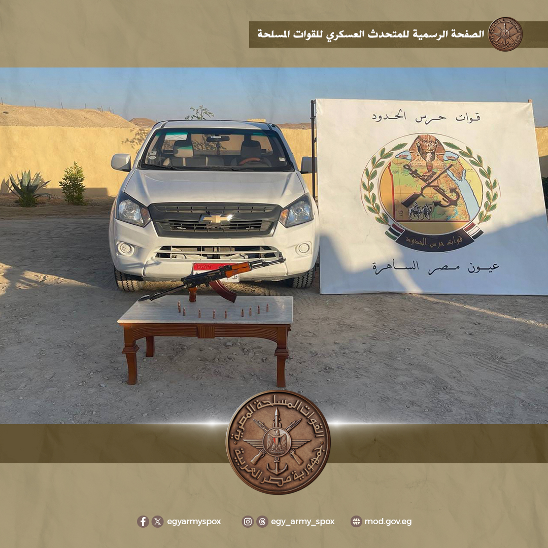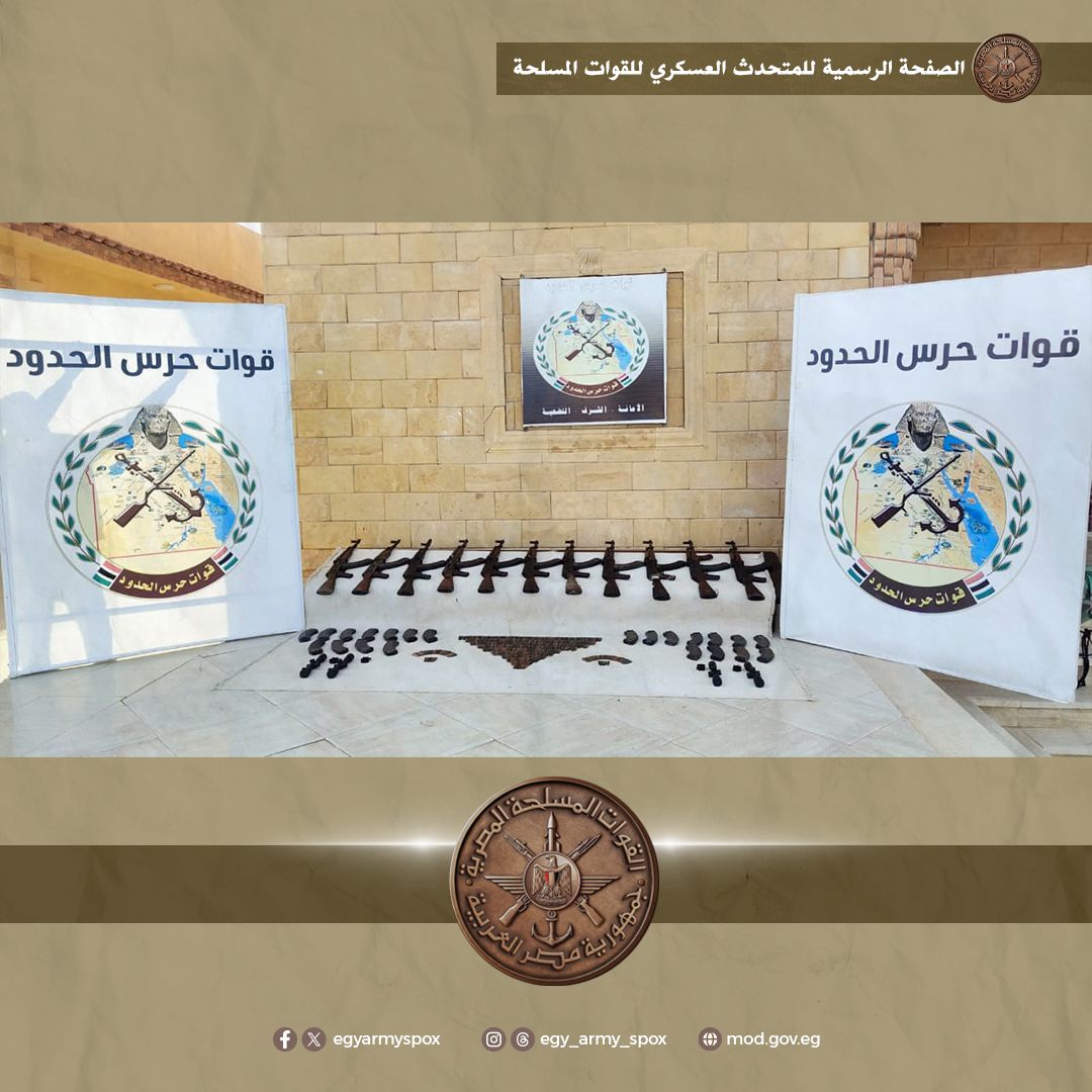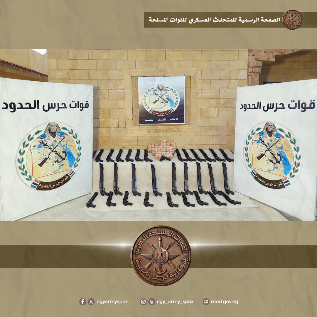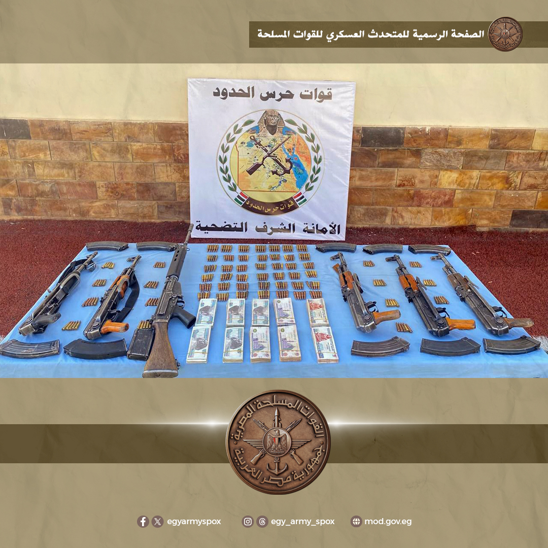 وفى توقيت متزامن نجحت قوات حرس الحدود على الاتجاه الاستراتيجي الغربي فى إحباط محاولات لتهريب كميات من الأسلحة والذخائر حيث تم ضبط عدد ( 11 ) بندقية آلية ، و( 30 ) بندقية خرطوش ، و( 1 ) مسدس و( 33 ) خزنة ، و( 4 ) تلسكوب وعدد ( 443 ) طلقة ، و( 12800 ) قرص مخدر .