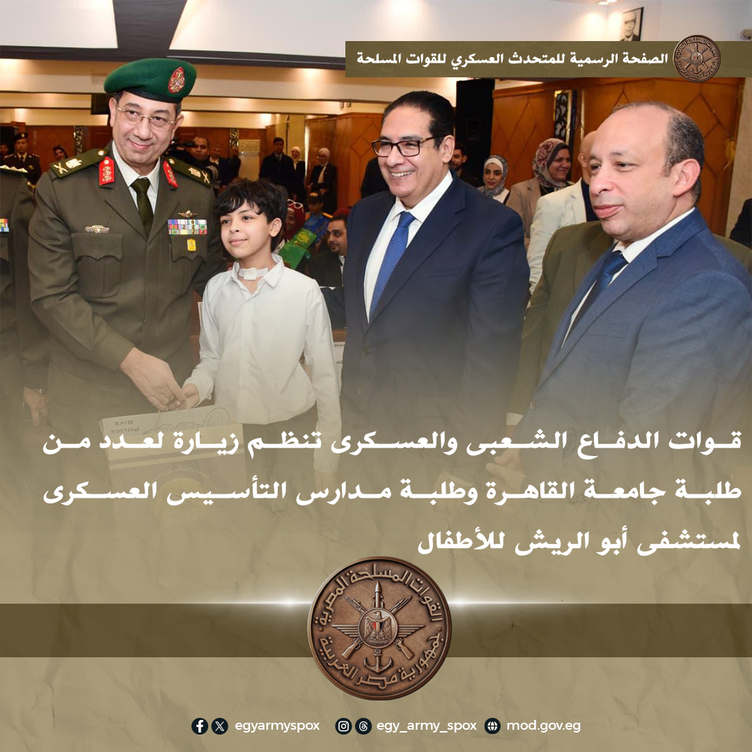 نظمت قوات الدفاع الشعبى والعسكرى زيارة لعدد من ضباط وضباط صف قوات الدفاع الشعبى والعسكرى وطلبة جامعة القاهرة وطلبة مدارس التأسيس العسكرى لمستشفى أبو الريش للأطفال.