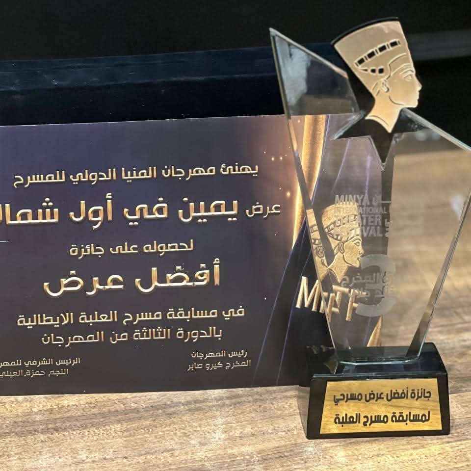 وشارك عرض «يمين في أول شمال» ضمن مسابقة مسرح العلبة الإيطالية، مقدمًا تجربة مسرحية تجمع بين الكوميديا الخفيفة والدراما النفسية، في طرح إنساني يتناول العلاقات البشرية والاختيارات المصيرية، وتأثير اللحظات الصغيرة القادرة على تغيير مسار الإنسان دون أن ينتبه.