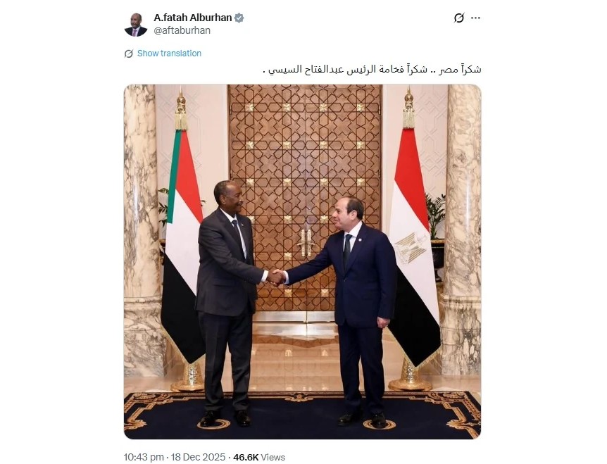 وعلق البرهان على الصورة قائلاً: «شكراً مصر.. شكراً فخامة الرئيس عبدالفتاح السيسي»، في إشارة إلى العلاقات التاريخية والأخوية بين البلدين، ودور مصر في دعم جهود السودان في مختلف المجالات الإقليمية والسياسية.