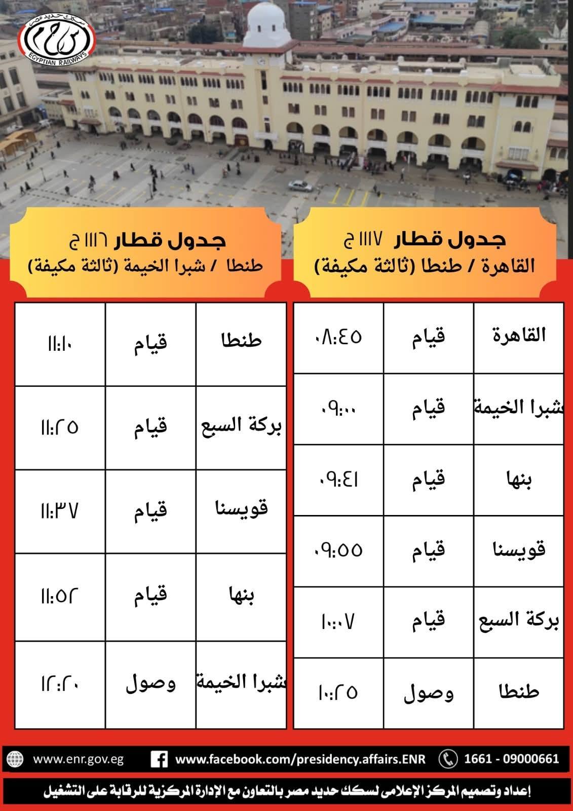 - القطار رقم 1117 بعربات درجة ثالثة مكيفة، يقوم من محطة القاهرة الساعة 8:45 صباحًا، ويصل إلى محطة طنطا الساعة 10:25 صباحًا؛ طبقًا للجدول المرفق ولا يعمل أيام الجمع والعطلات.
