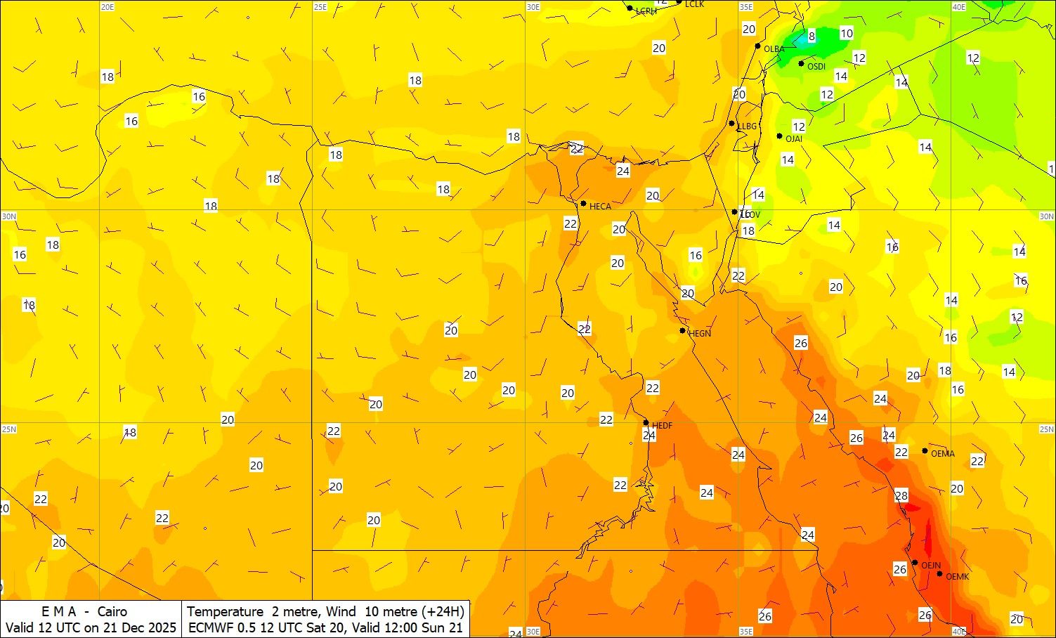 جنوب الصعيد: أسيوط 6/23، سوهاج 8/24، قنا 10/25، الأقصر 10/25، أسوان 11/25، الوادي الجديد 12/23، أبو سمبل 12/25.