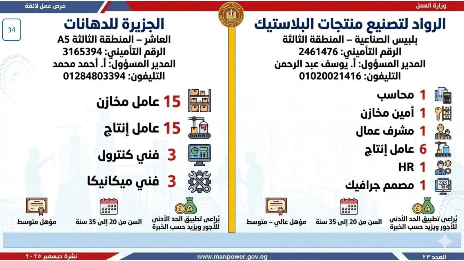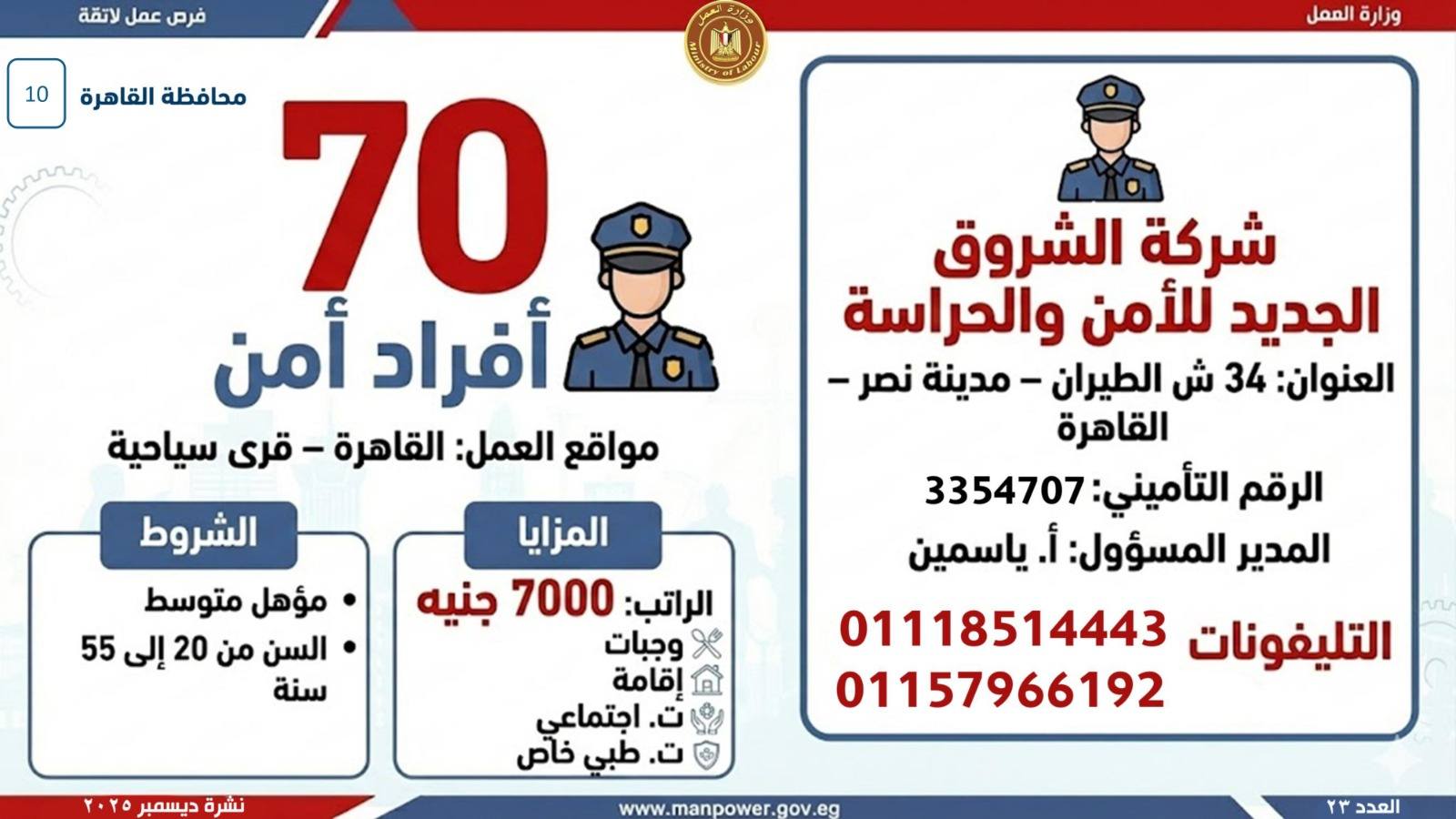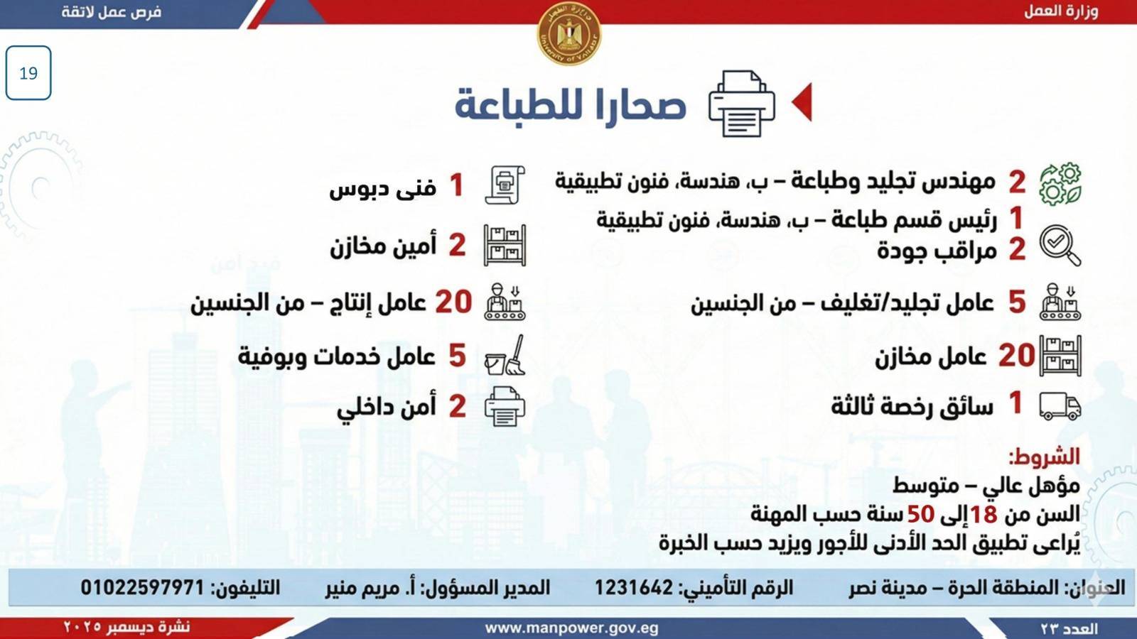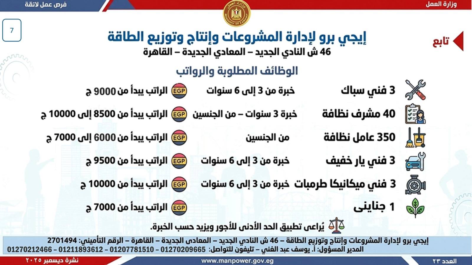 أعلن وزير العمل، محمد جبران، اليوم، عن إصدار نشرة التوظيف نصف الشهرية، والتي تتضمن فرص عمل جديدة متاحة في عدد من المحافظات، وذلك بالتعاون بين وزارة العمل وشركات القطاع الخاص، في إطار جهود الدولة المستمرة لتوفير فرص عمل لائقة للشباب، وتنفيذًا لتوجيهات القيادة السياسية بدمج مختلف فئات المجتمع في سوق العمل، وعلى رأسهم ذوو الهمم.