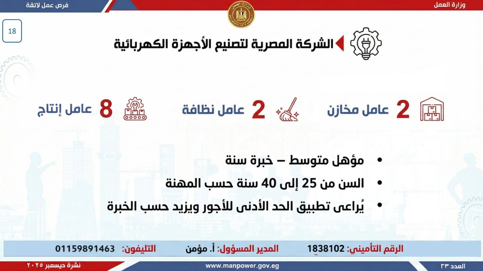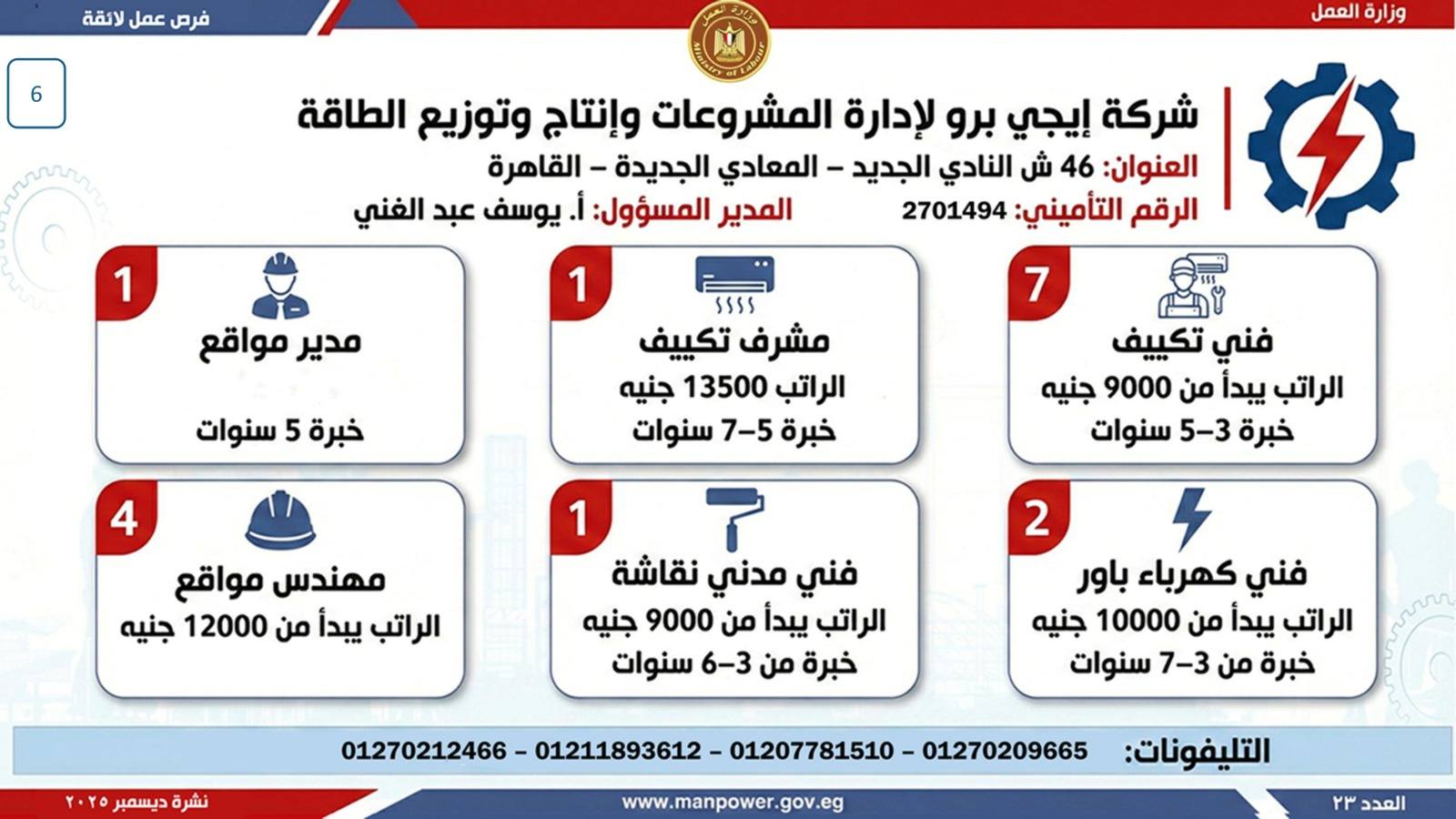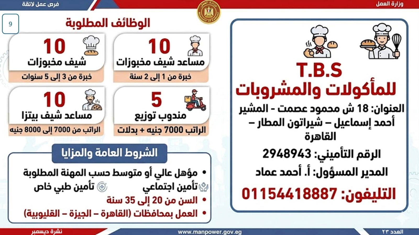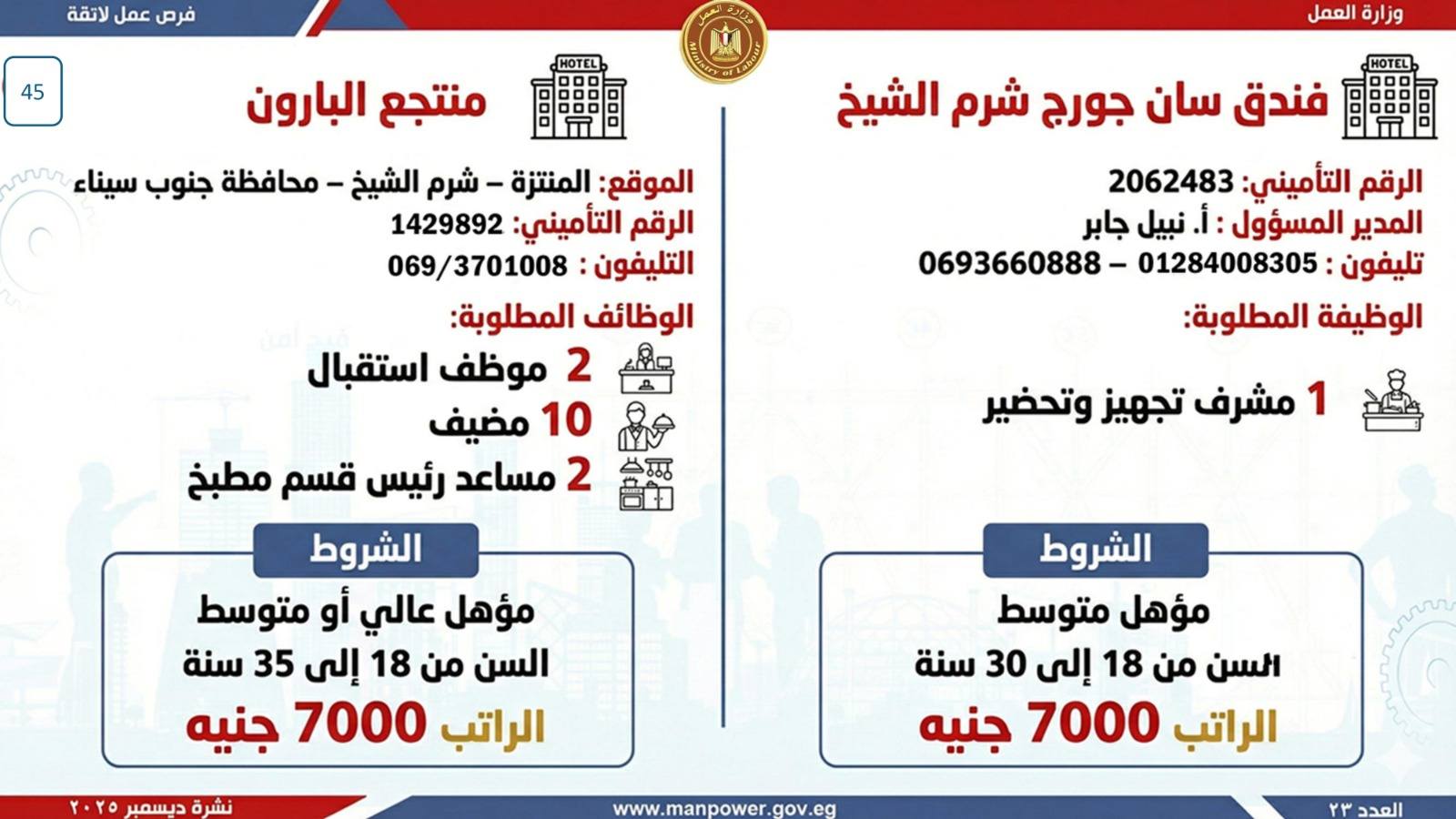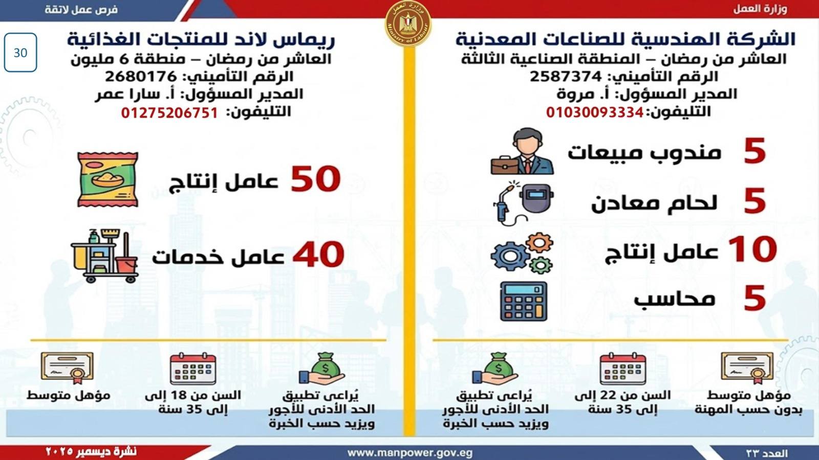 أعلن وزير العمل، محمد جبران، اليوم، عن إصدار نشرة التوظيف نصف الشهرية، والتي تتضمن فرص عمل جديدة متاحة في عدد من المحافظات، وذلك بالتعاون بين وزارة العمل وشركات القطاع الخاص، في إطار جهود الدولة المستمرة لتوفير فرص عمل لائقة للشباب، وتنفيذًا لتوجيهات القيادة السياسية بدمج مختلف فئات المجتمع في سوق العمل، وعلى رأسهم ذوو الهمم.