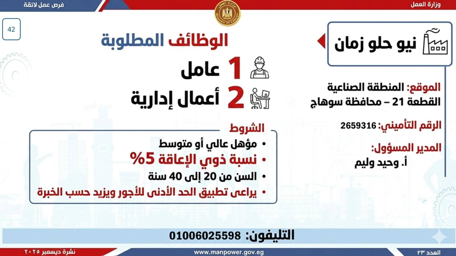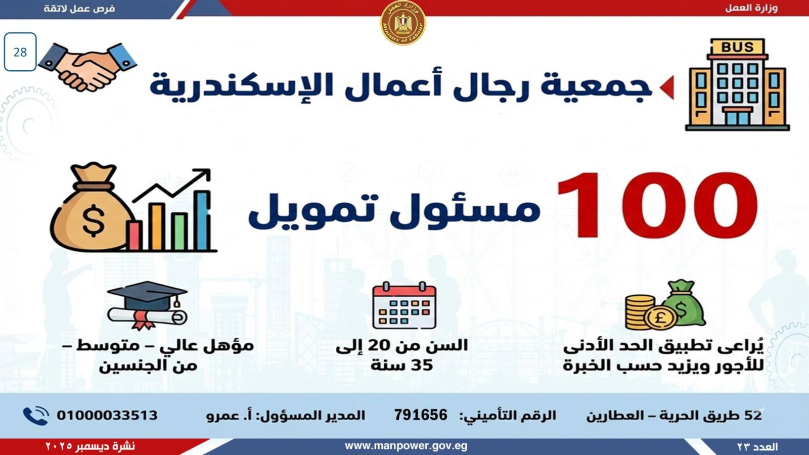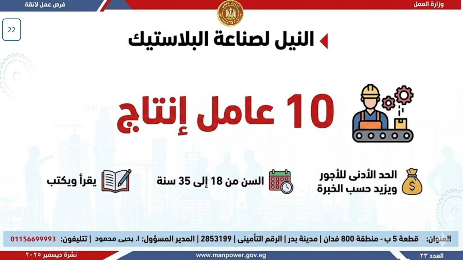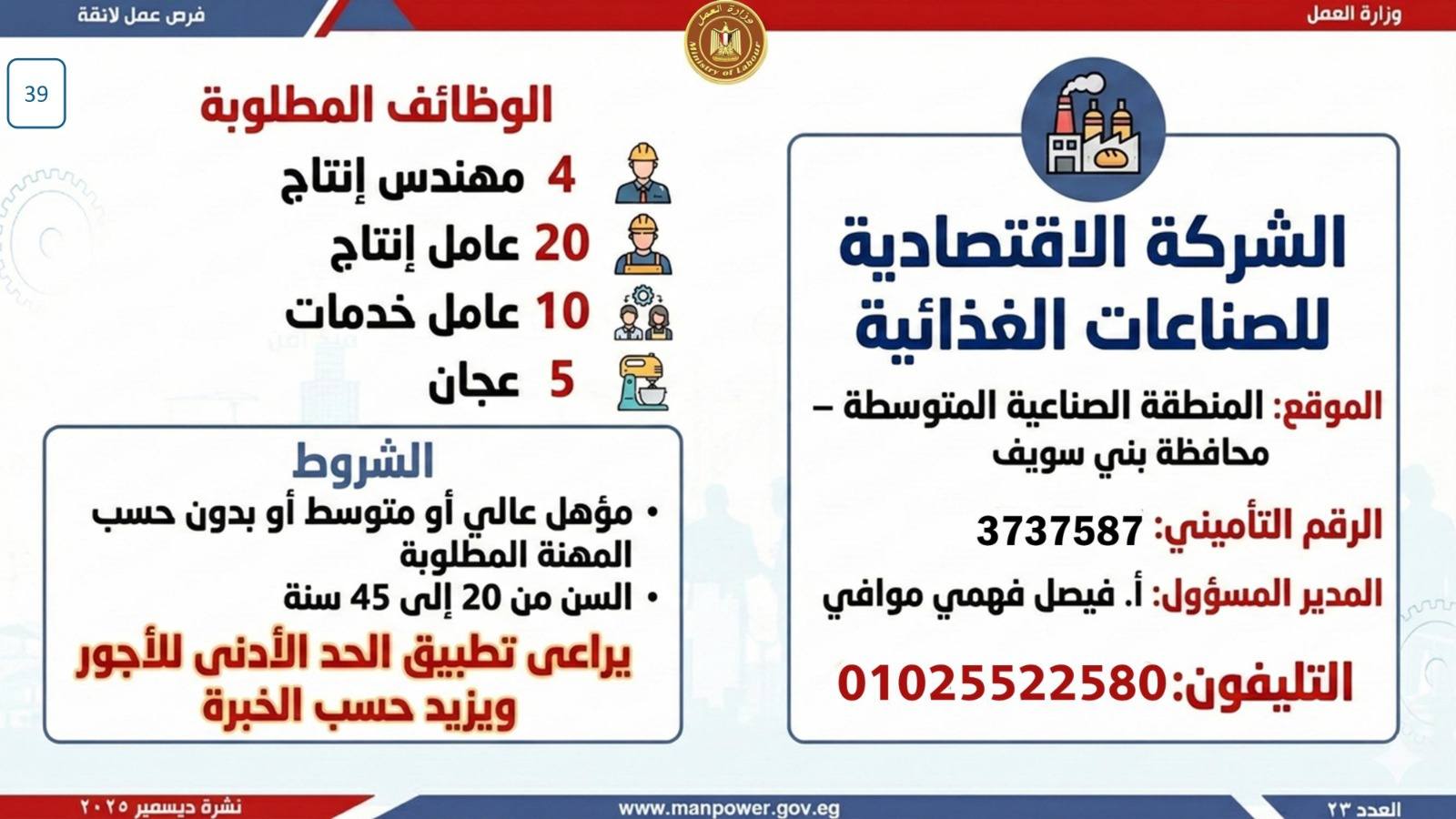 أعلن وزير العمل، محمد جبران، اليوم، عن إصدار نشرة التوظيف نصف الشهرية، والتي تتضمن فرص عمل جديدة متاحة في عدد من المحافظات، وذلك بالتعاون بين وزارة العمل وشركات القطاع الخاص، في إطار جهود الدولة المستمرة لتوفير فرص عمل لائقة للشباب، وتنفيذًا لتوجيهات القيادة السياسية بدمج مختلف فئات المجتمع في سوق العمل، وعلى رأسهم ذوو الهمم.