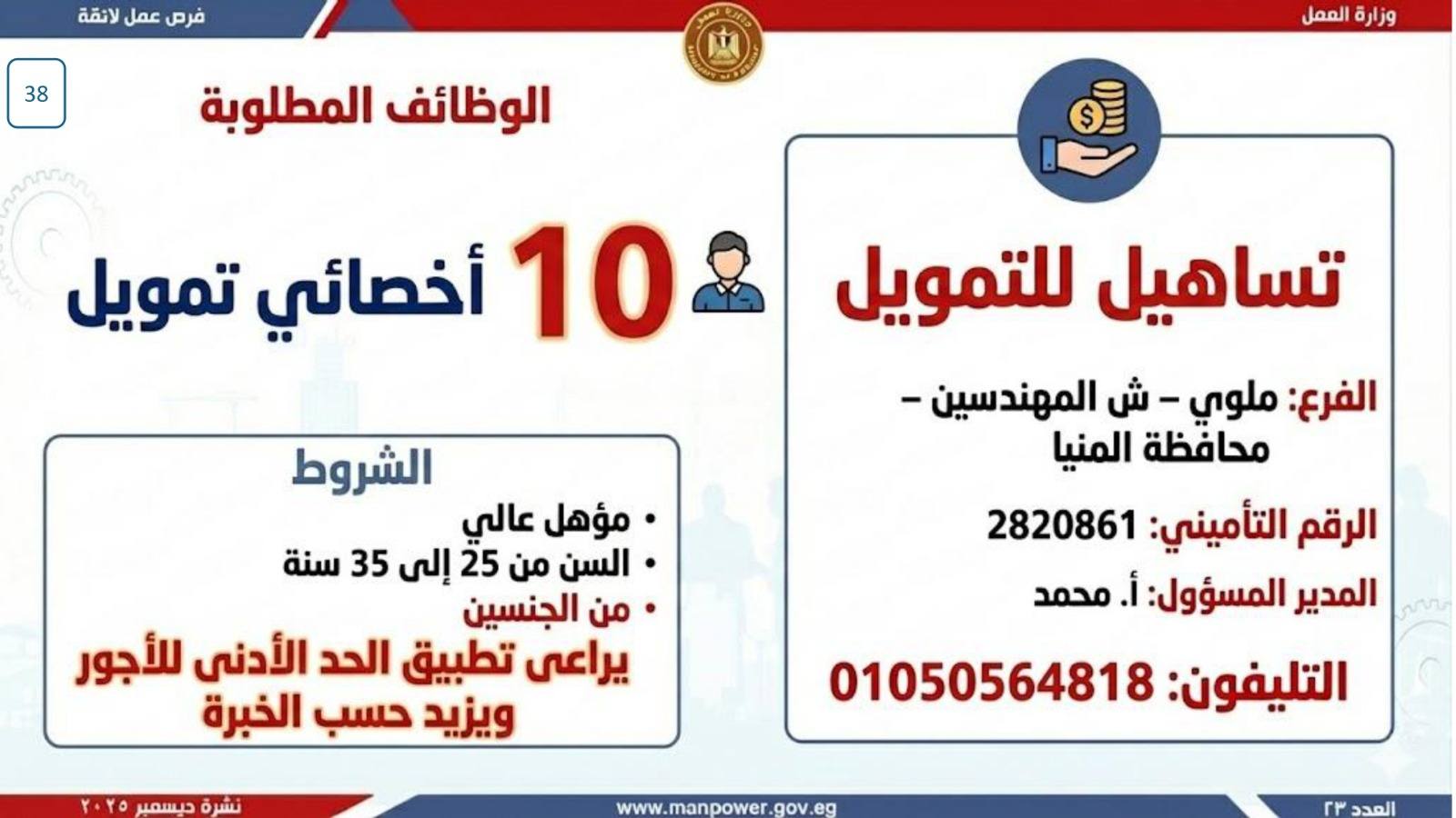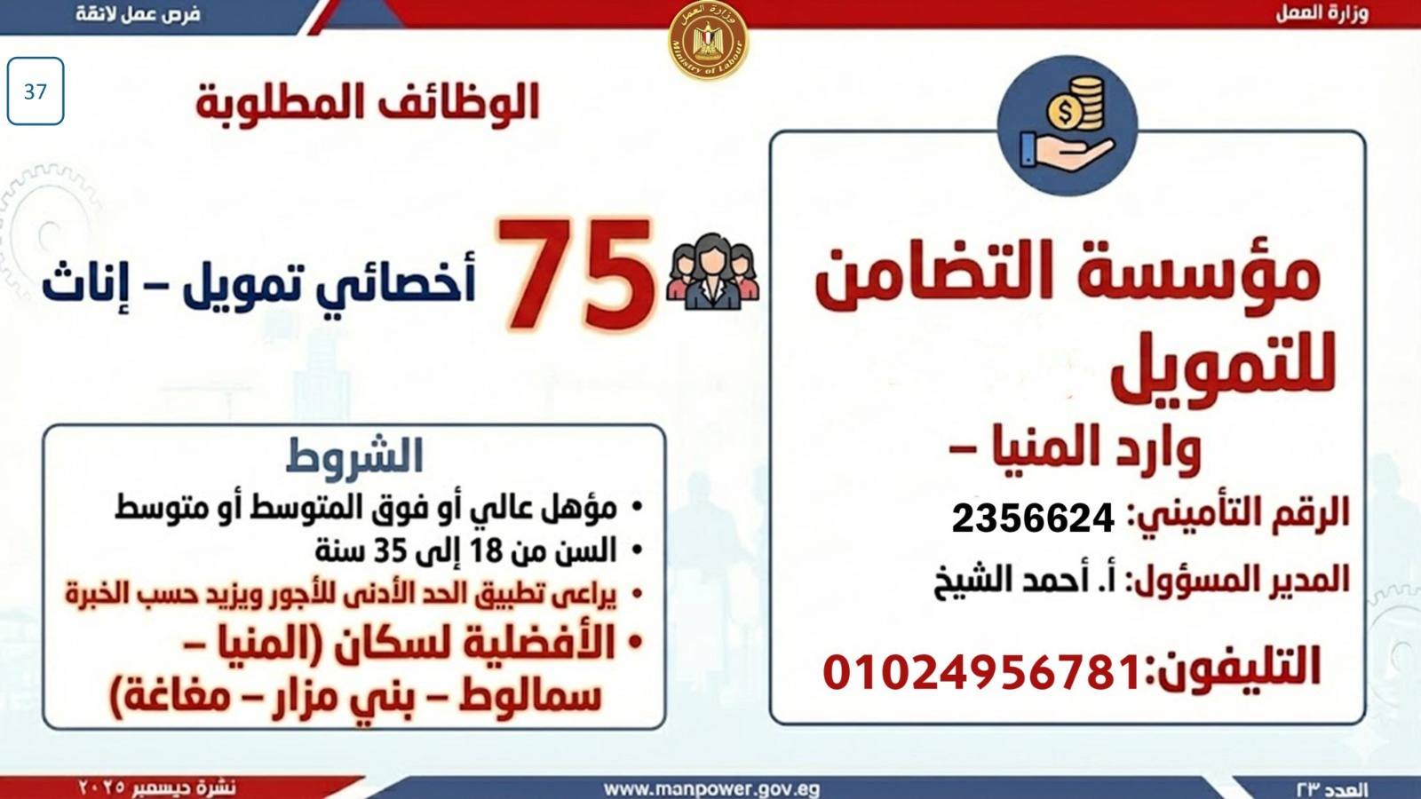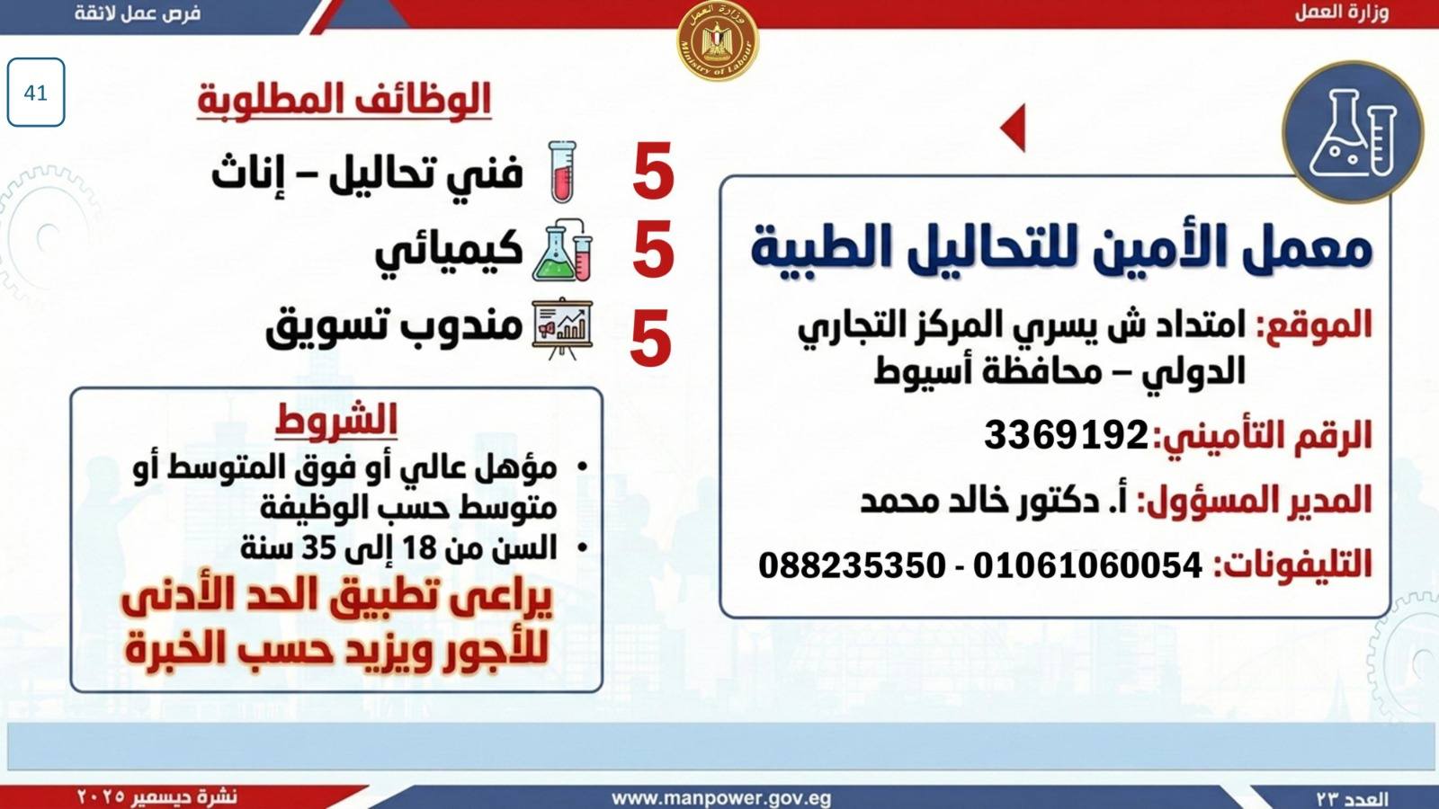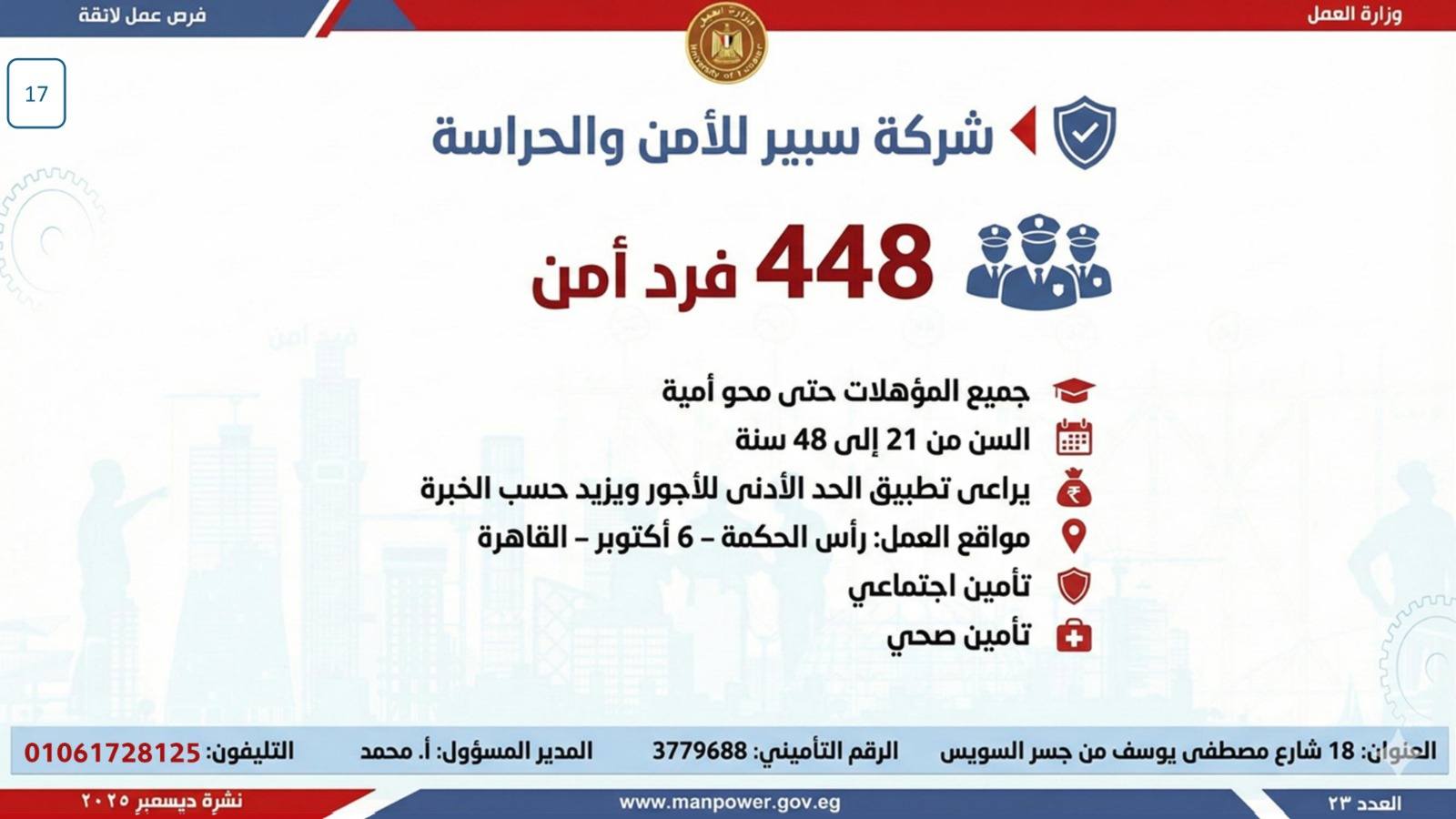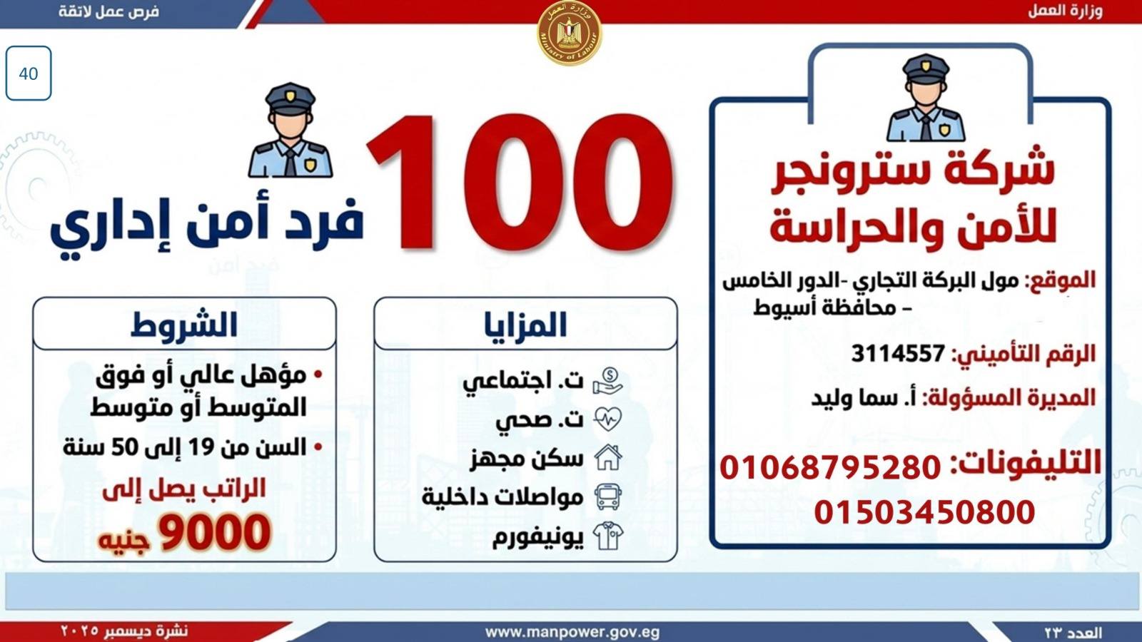 أعلن وزير العمل، محمد جبران، اليوم، عن إصدار نشرة التوظيف نصف الشهرية، والتي تتضمن فرص عمل جديدة متاحة في عدد من المحافظات، وذلك بالتعاون بين وزارة العمل وشركات القطاع الخاص، في إطار جهود الدولة المستمرة لتوفير فرص عمل لائقة للشباب، وتنفيذًا لتوجيهات القيادة السياسية بدمج مختلف فئات المجتمع في سوق العمل، وعلى رأسهم ذوو الهمم.