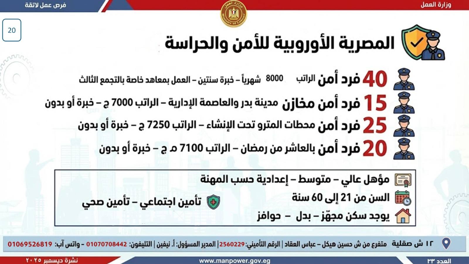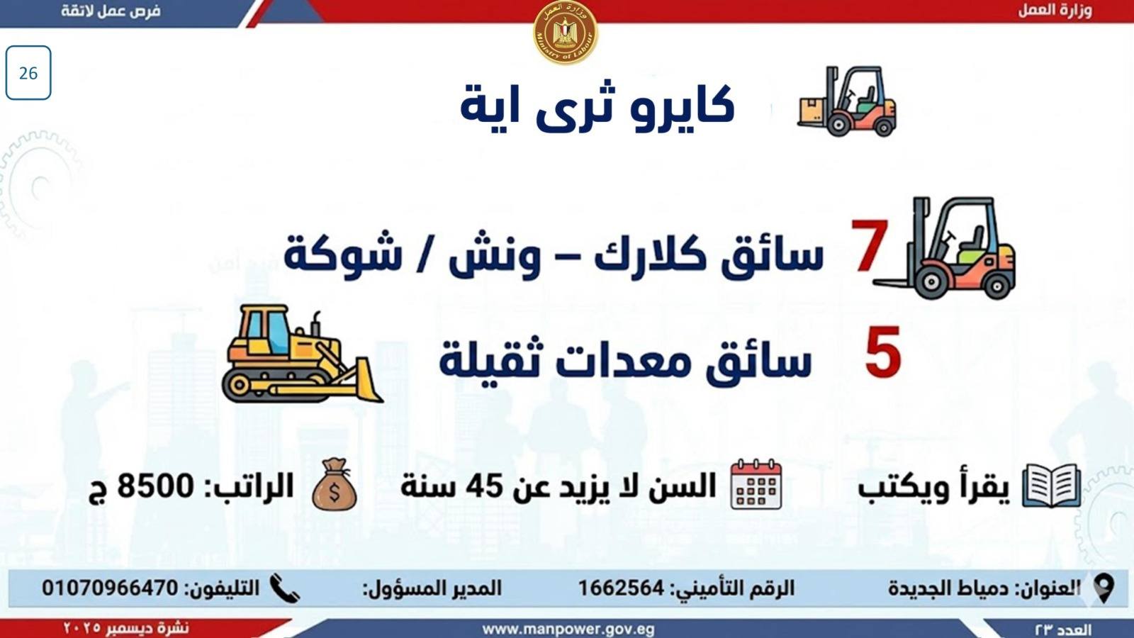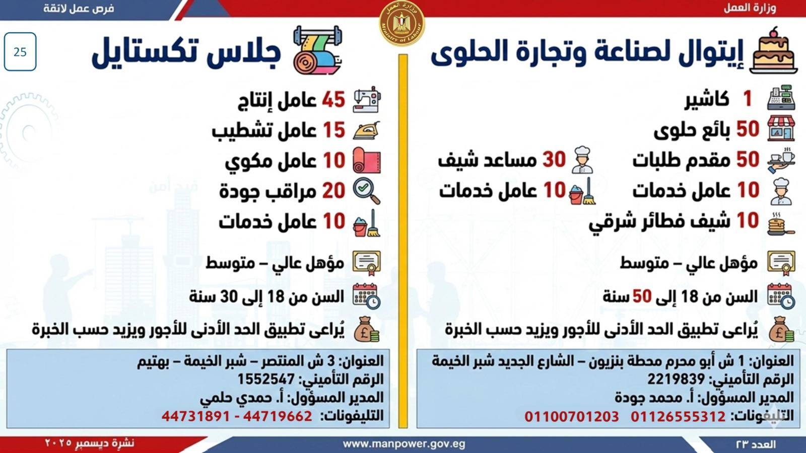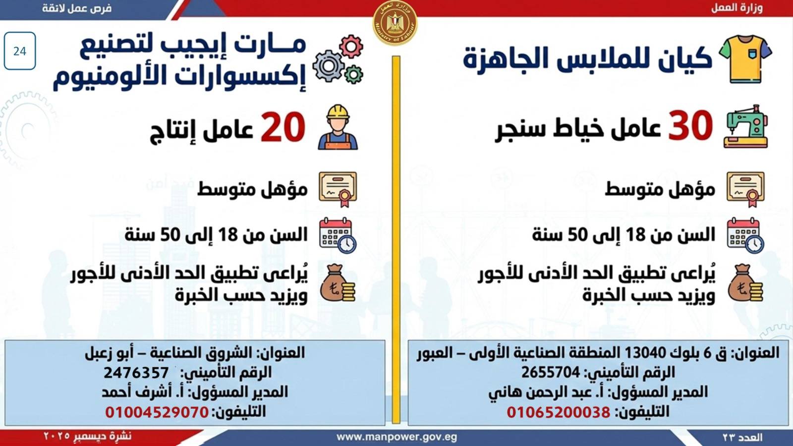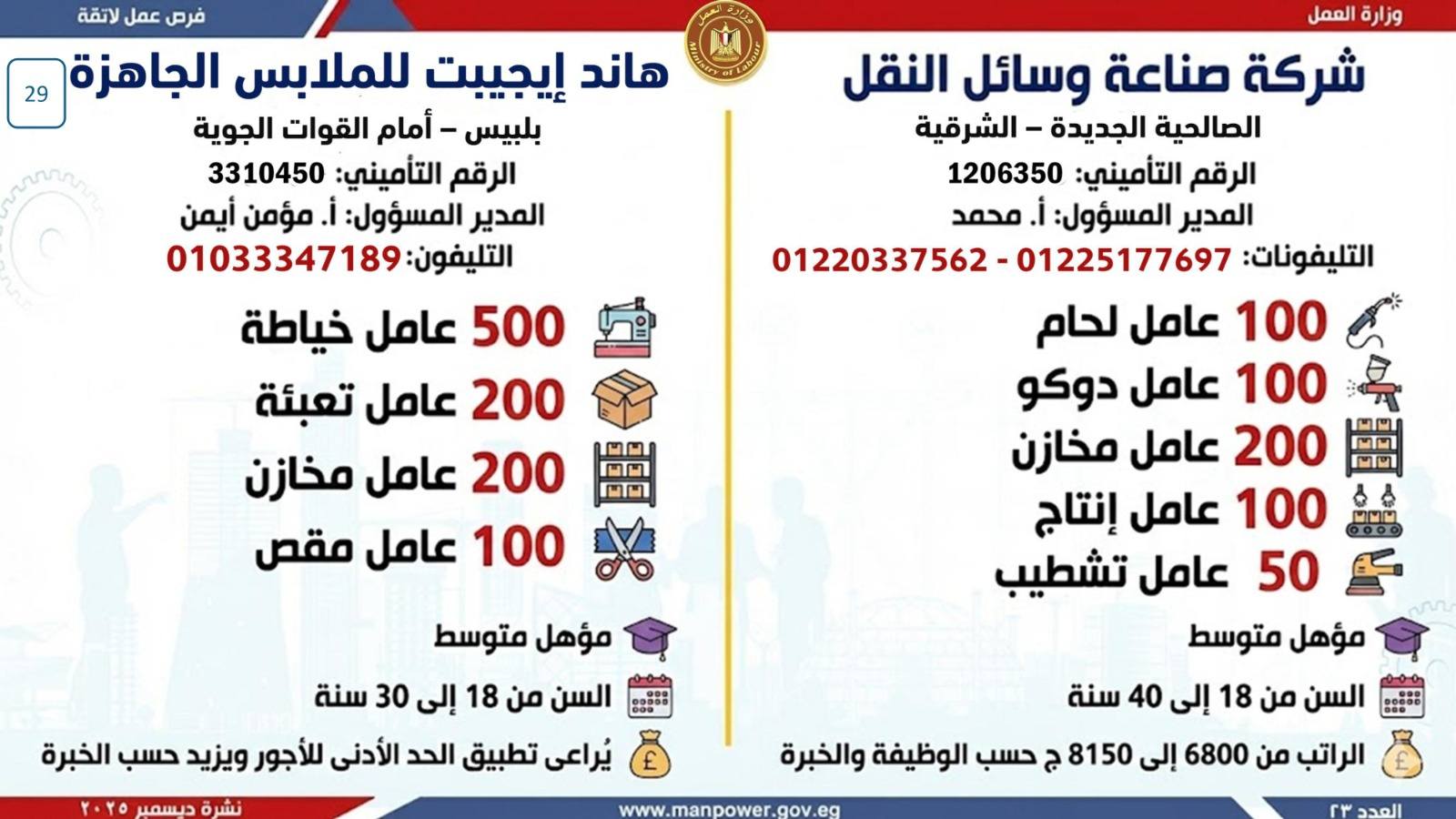 وبيّنت الوزارة أن التقديم على هذه الفرص يتم خلال شهر ديسمبر 2025، من خلال الإدارة العامة للتشغيل بمقر الوزارة القديم بمدينة نصر، أو عبر مديريات العمل بالمحافظات.