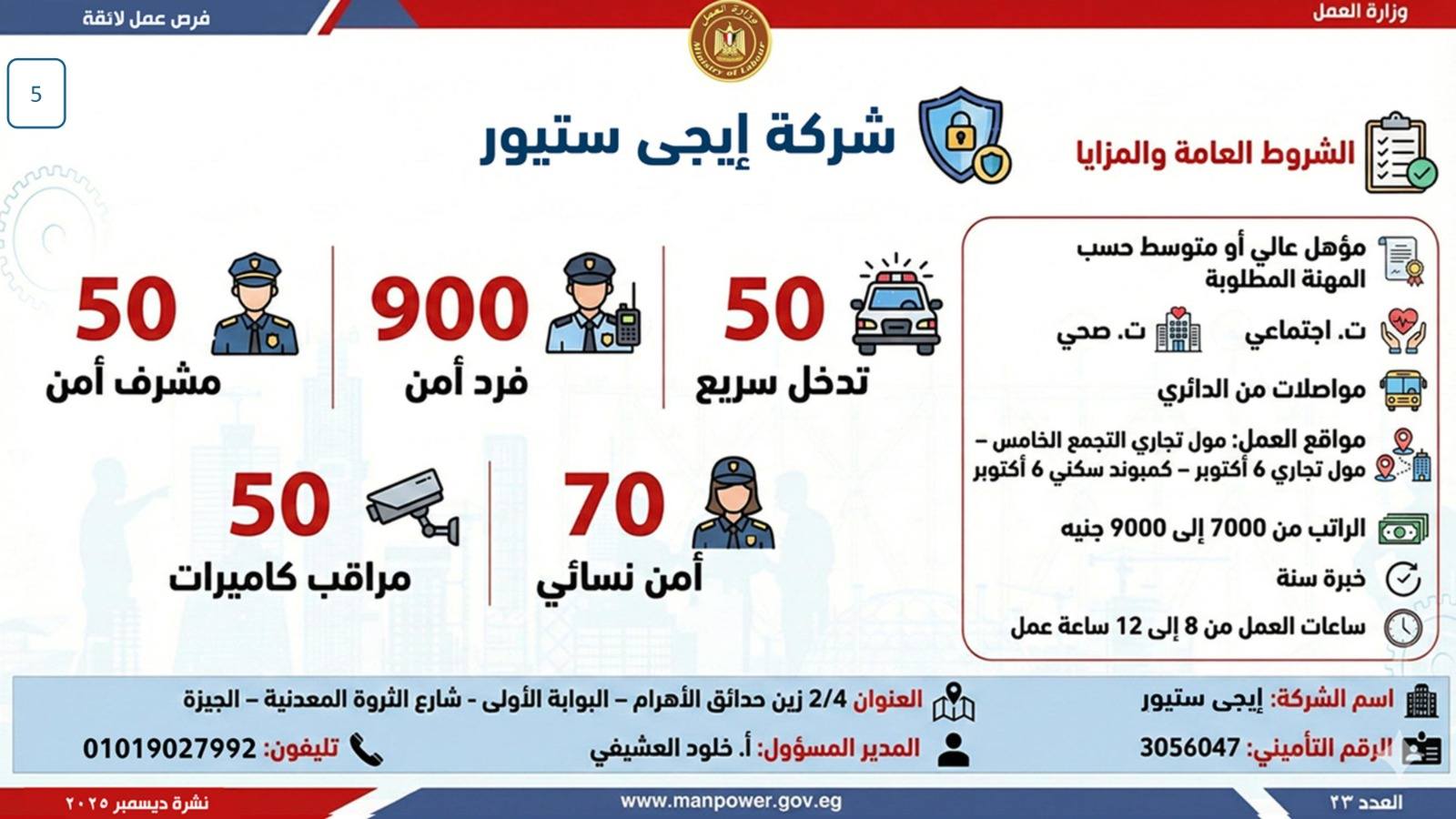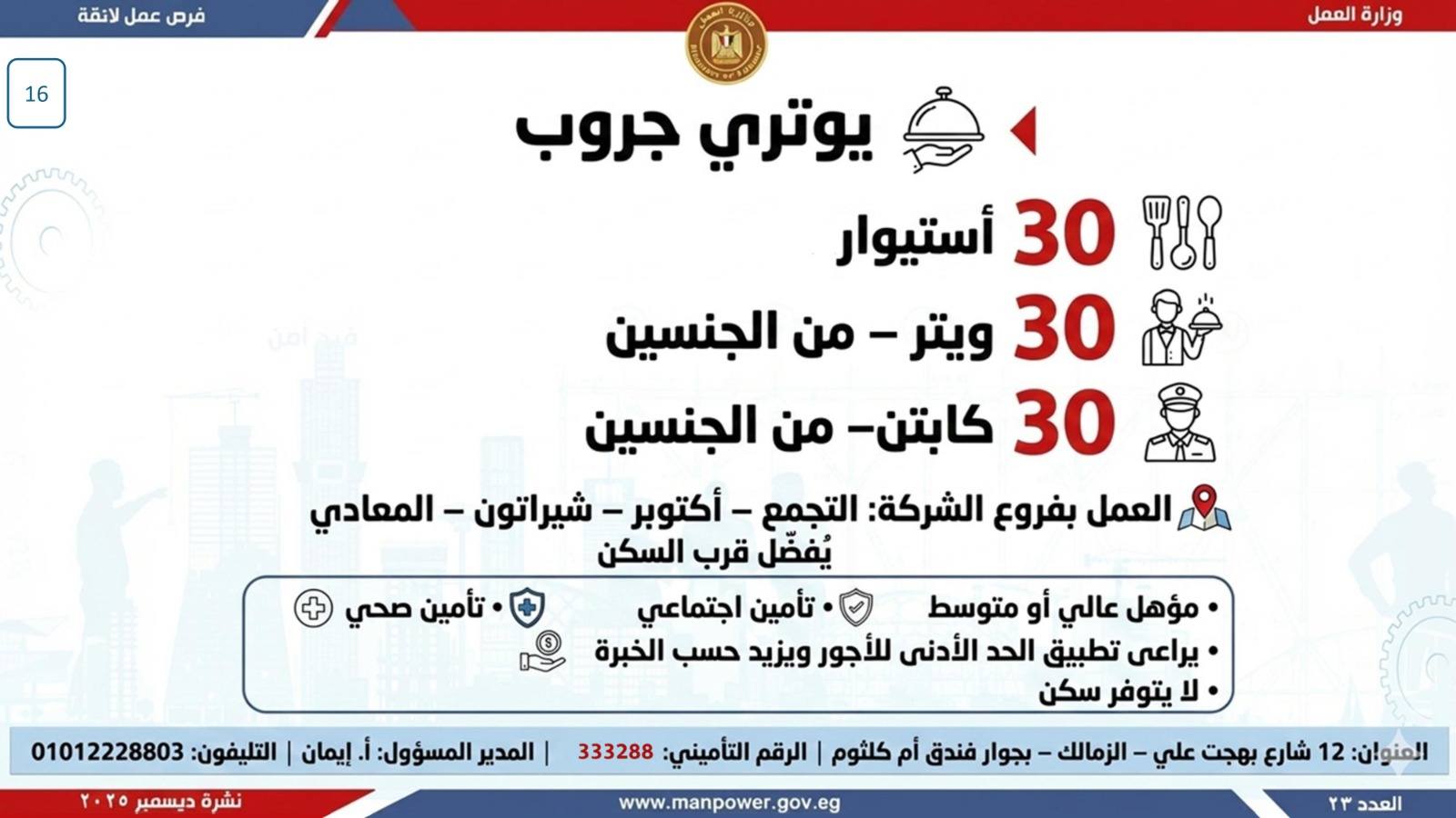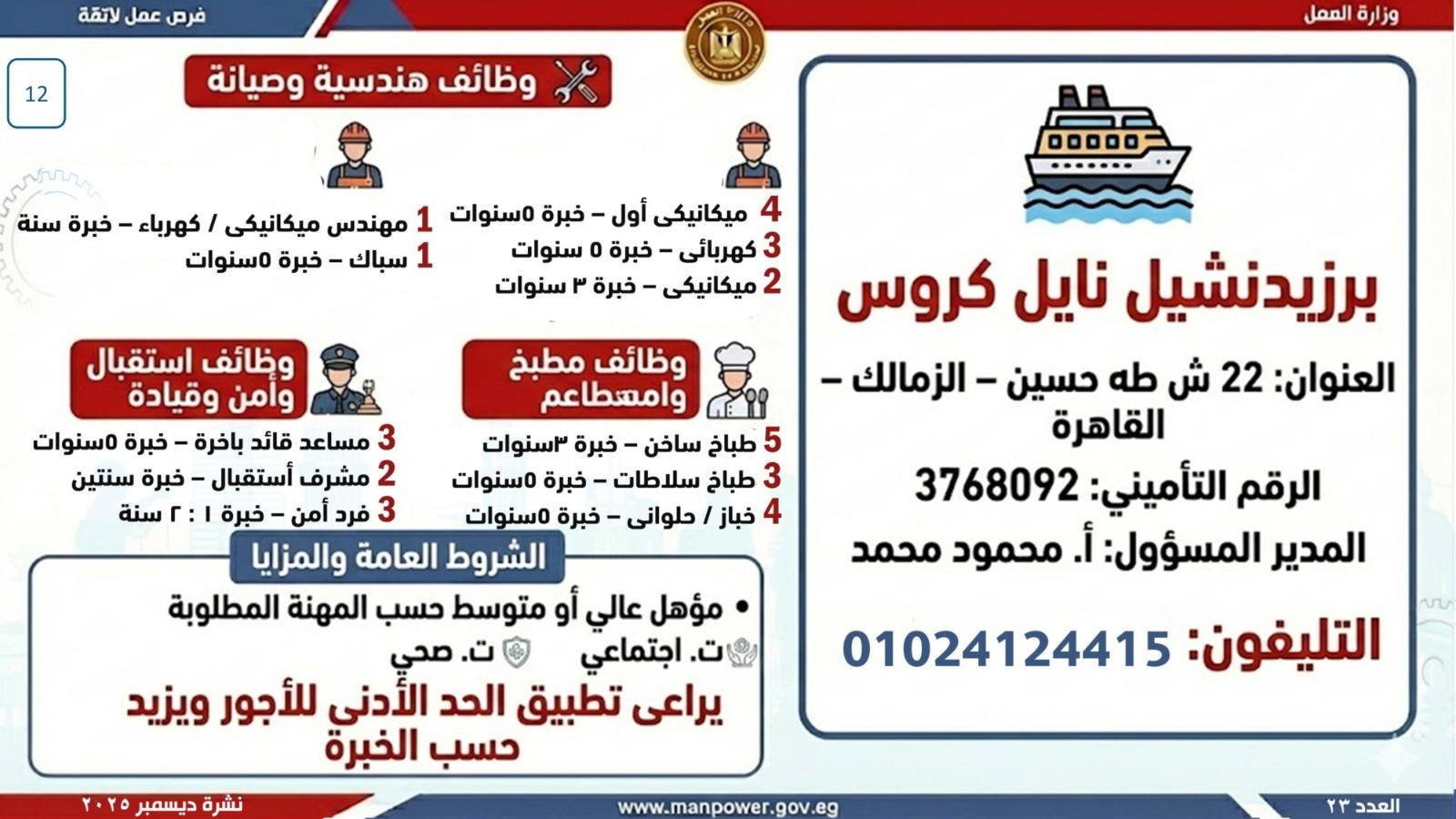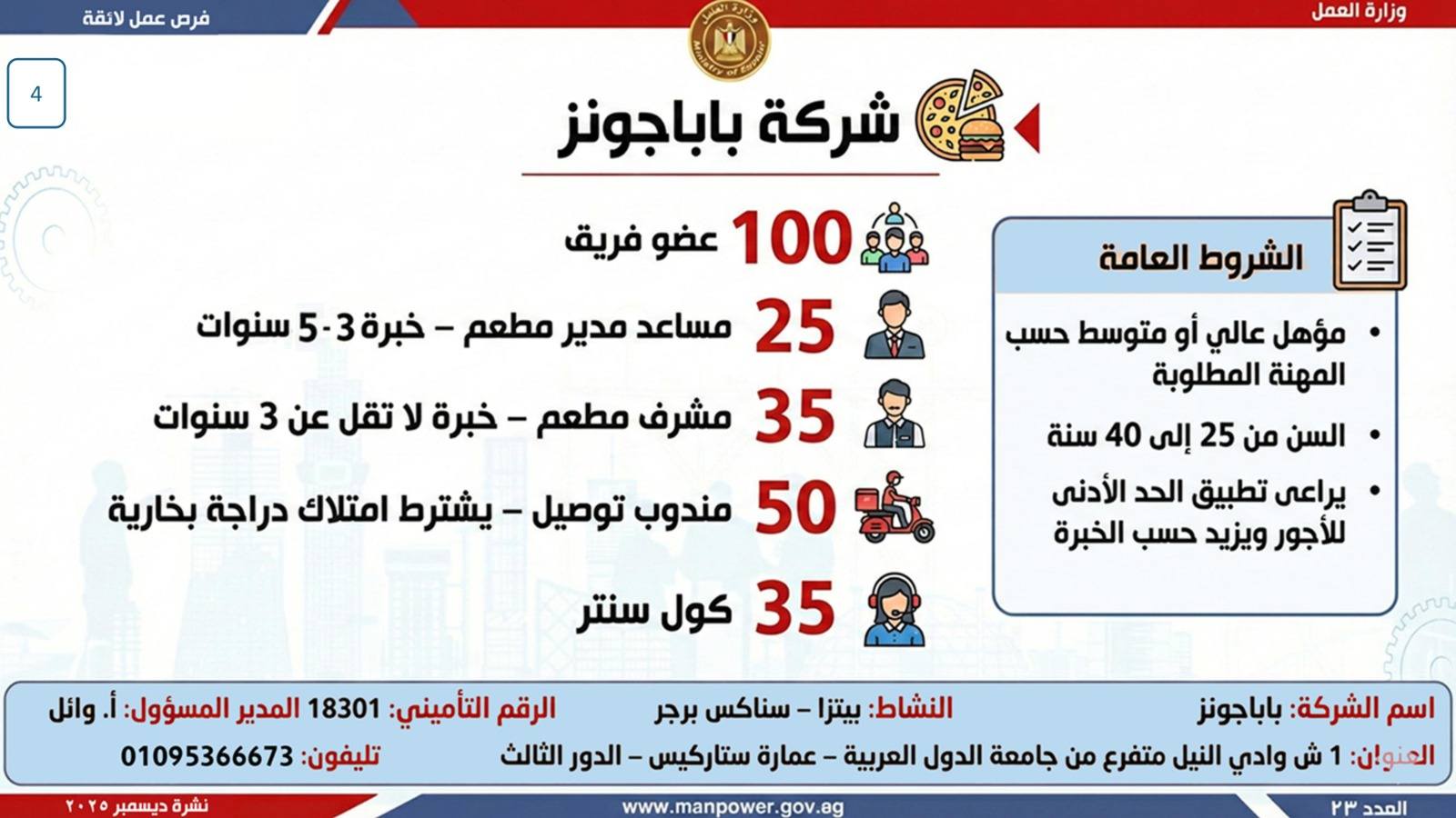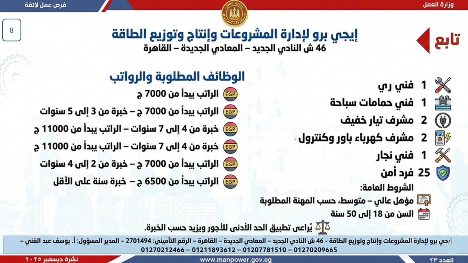 وبيّنت الوزارة أن التقديم على هذه الفرص يتم خلال شهر ديسمبر 2025، من خلال الإدارة العامة للتشغيل بمقر الوزارة القديم بمدينة نصر، أو عبر مديريات العمل بالمحافظات.