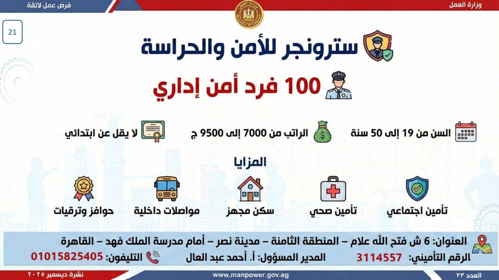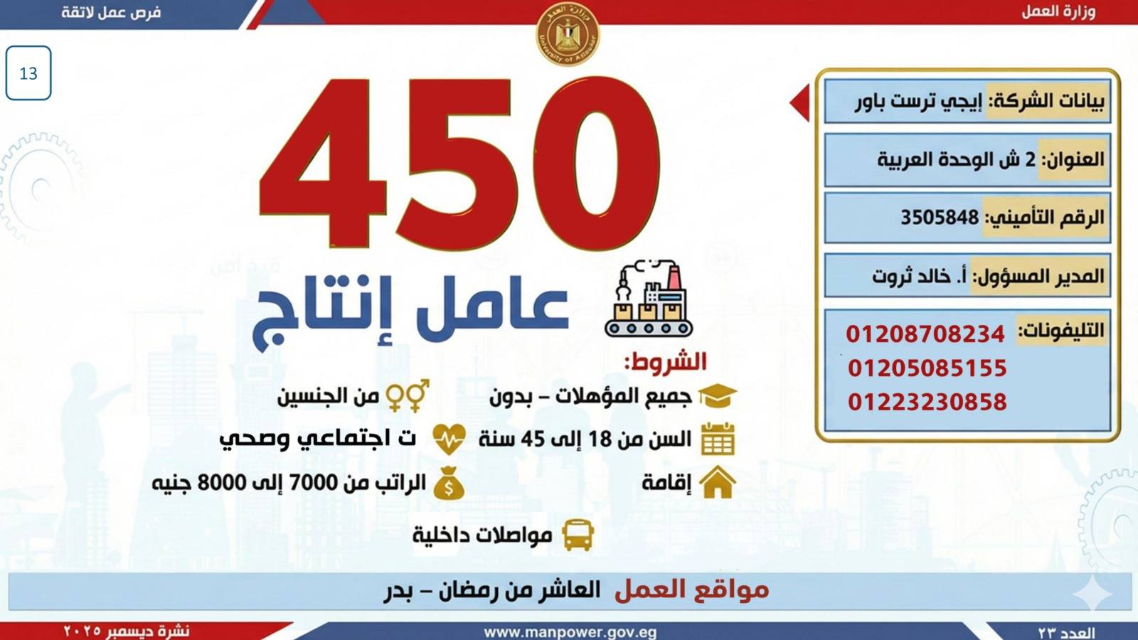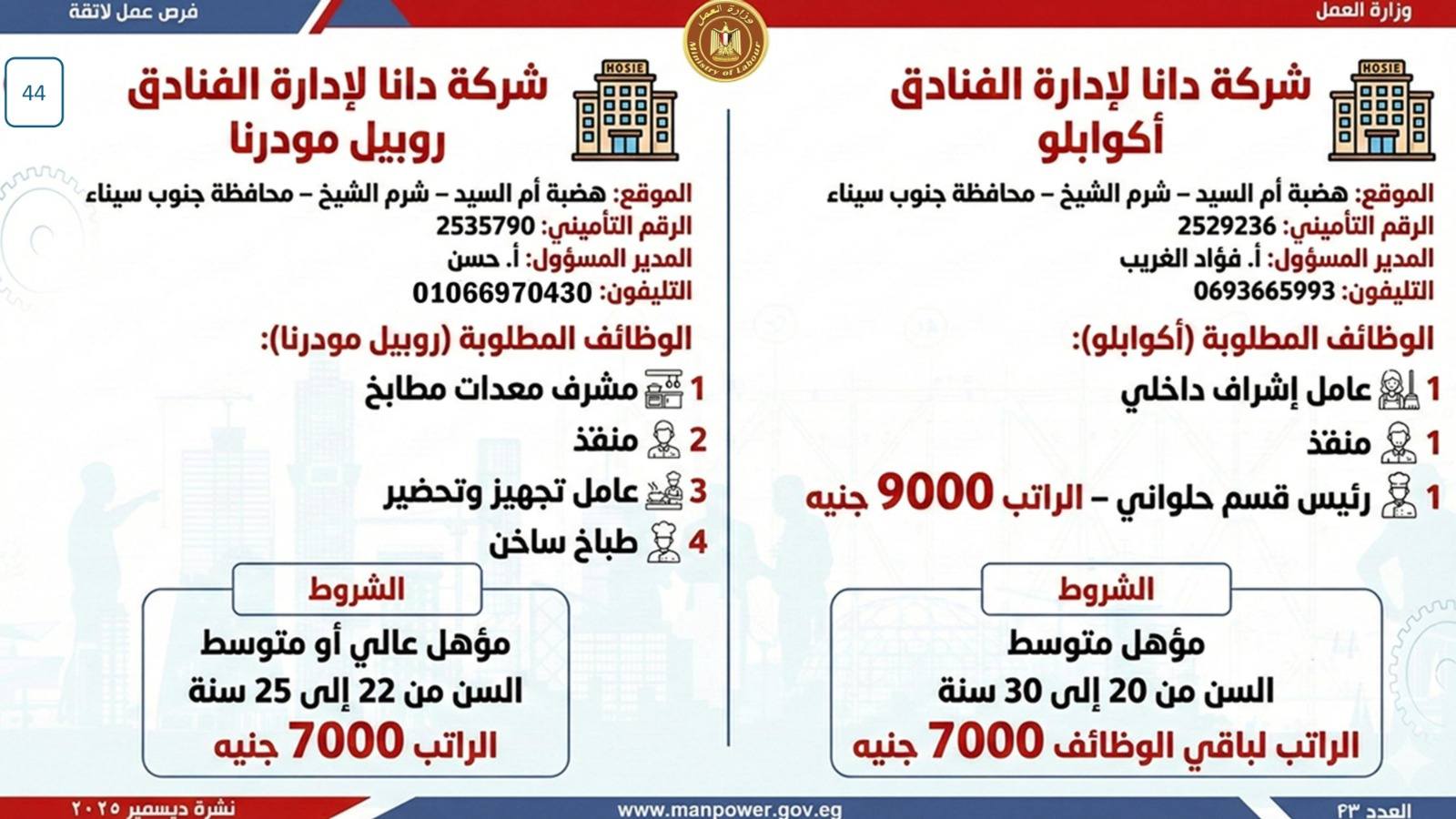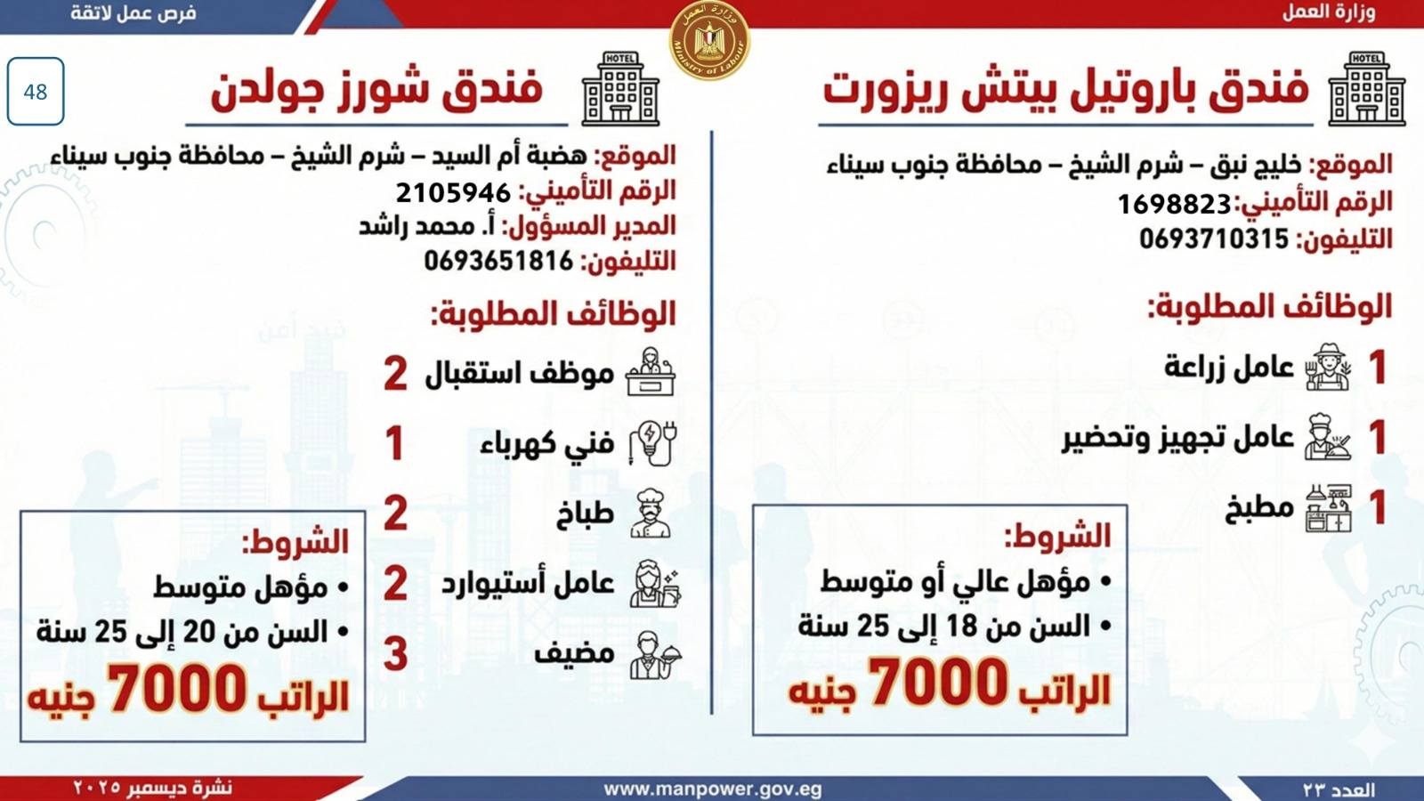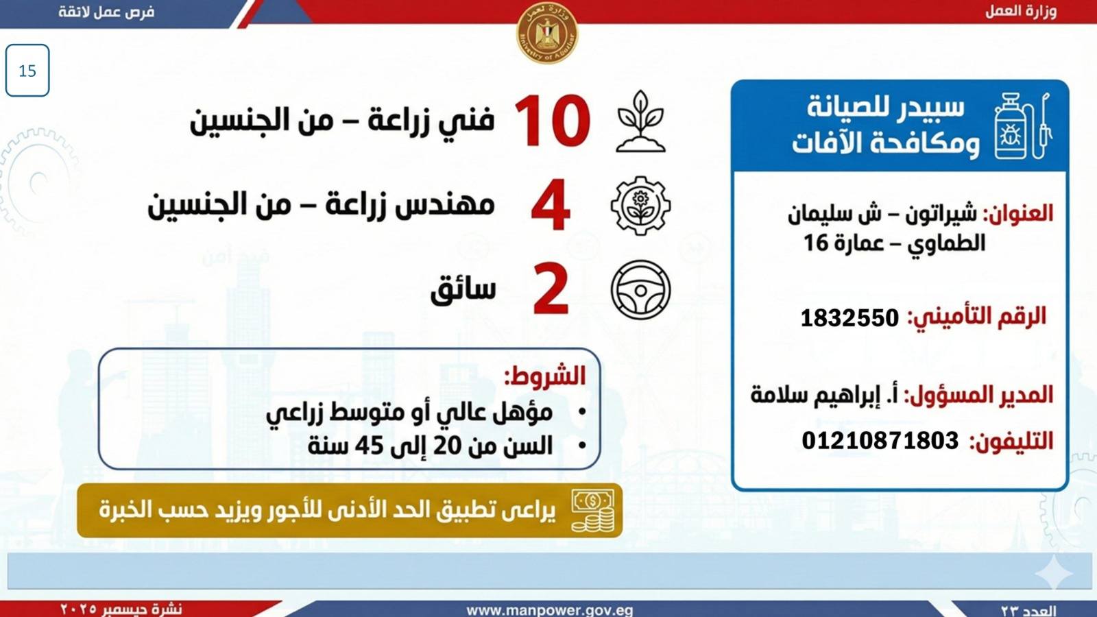 وبيّنت الوزارة أن التقديم على هذه الفرص يتم خلال شهر ديسمبر 2025، من خلال الإدارة العامة للتشغيل بمقر الوزارة القديم بمدينة نصر، أو عبر مديريات العمل بالمحافظات.