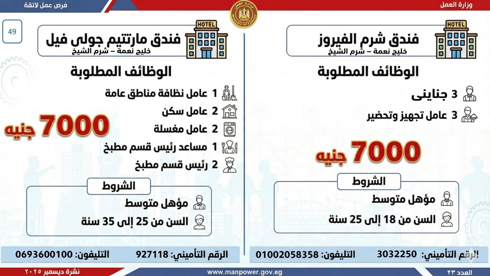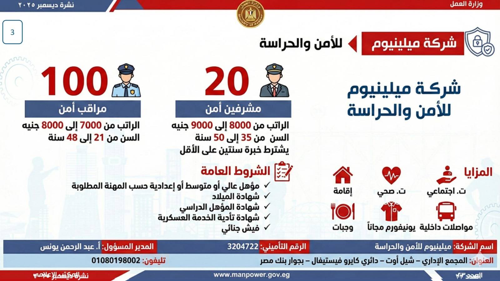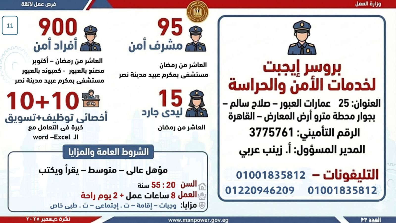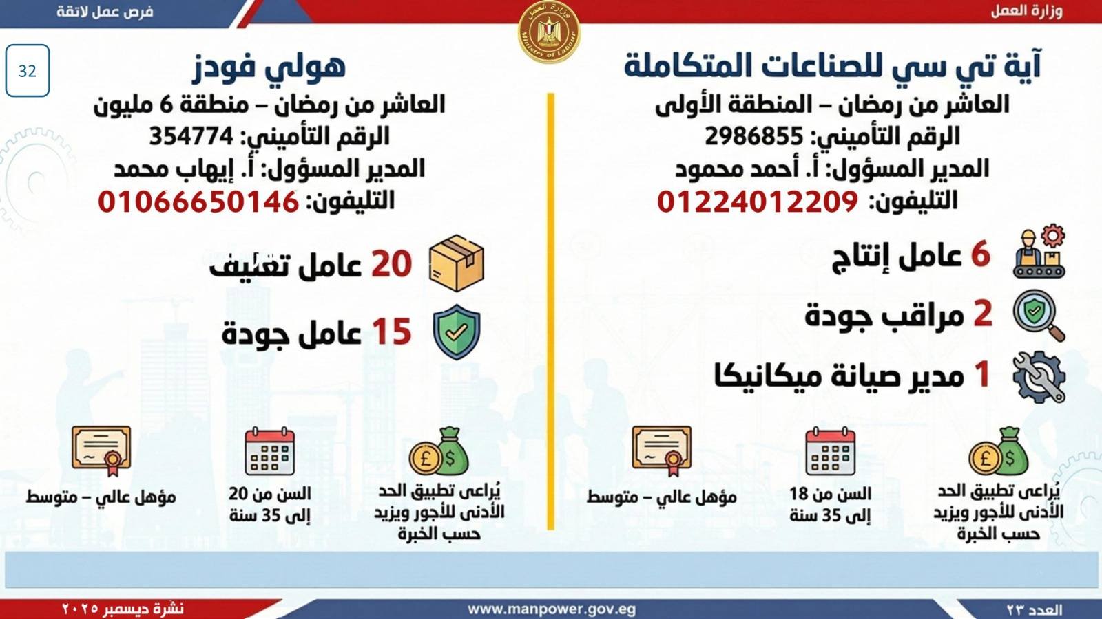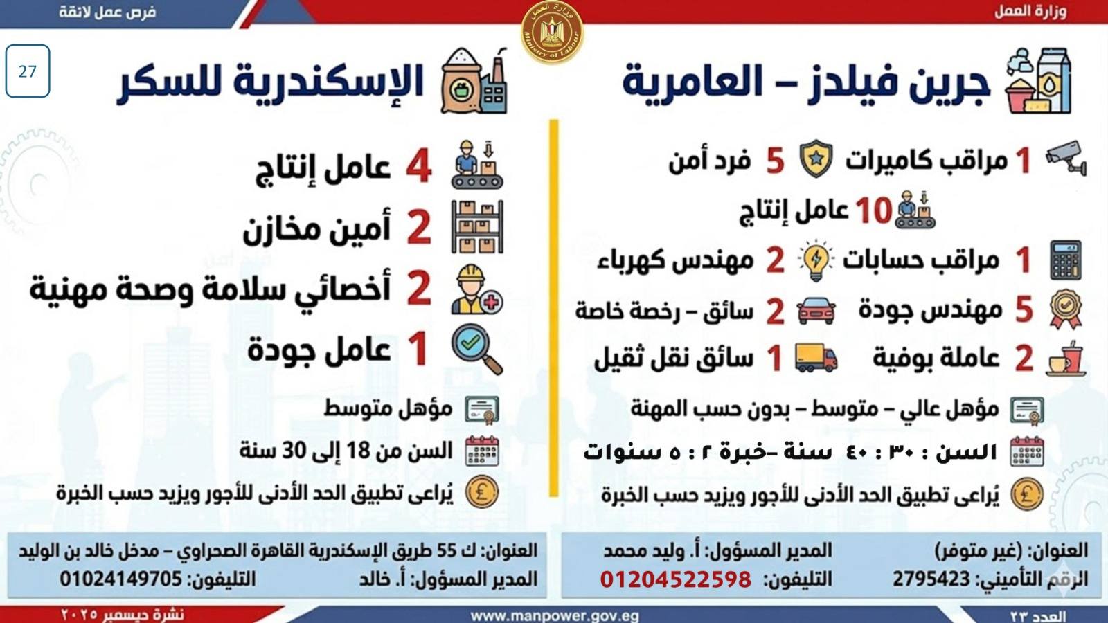 وبيّنت الوزارة أن التقديم على هذه الفرص يتم خلال شهر ديسمبر 2025، من خلال الإدارة العامة للتشغيل بمقر الوزارة القديم بمدينة نصر، أو عبر مديريات العمل بالمحافظات.