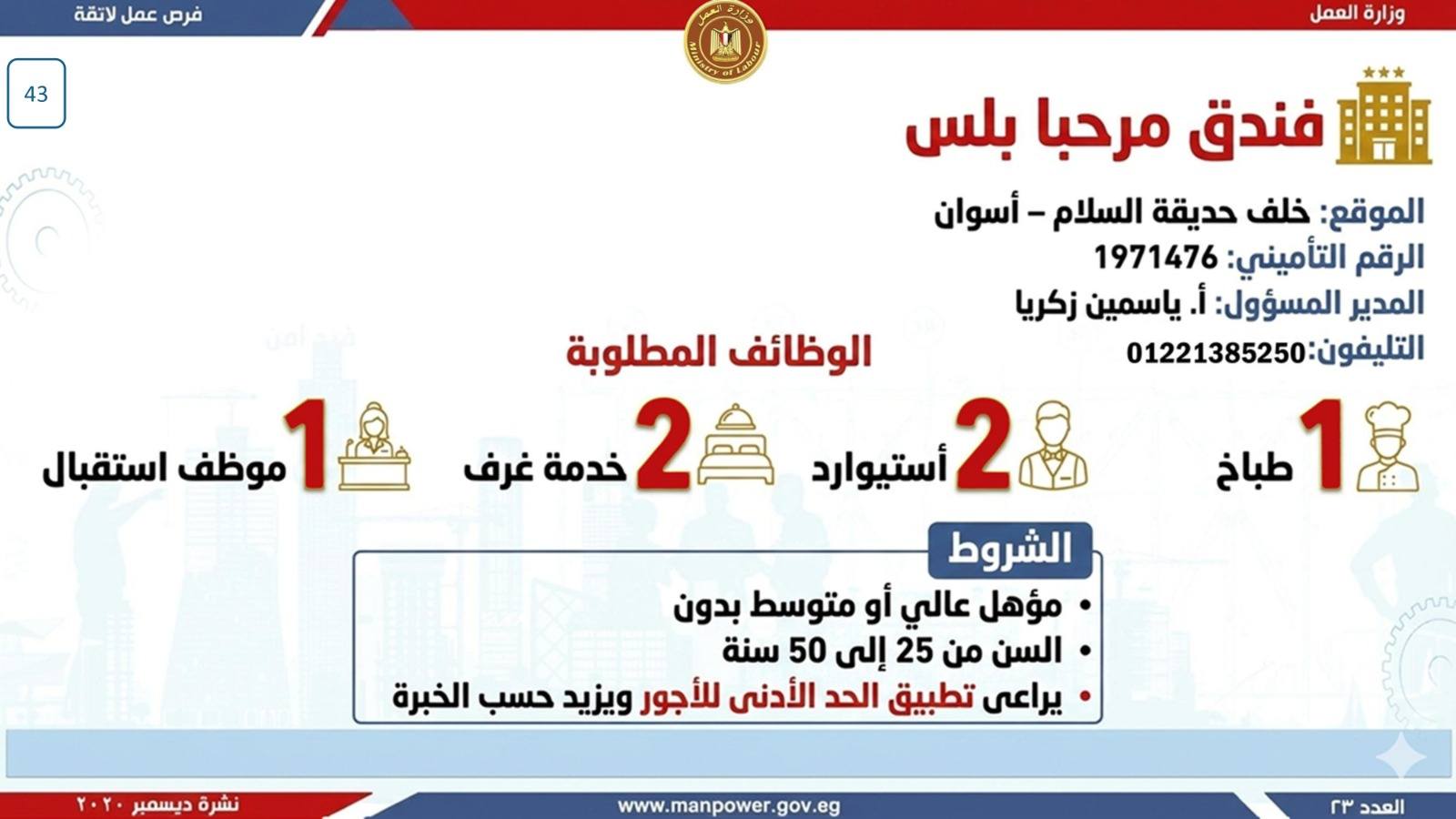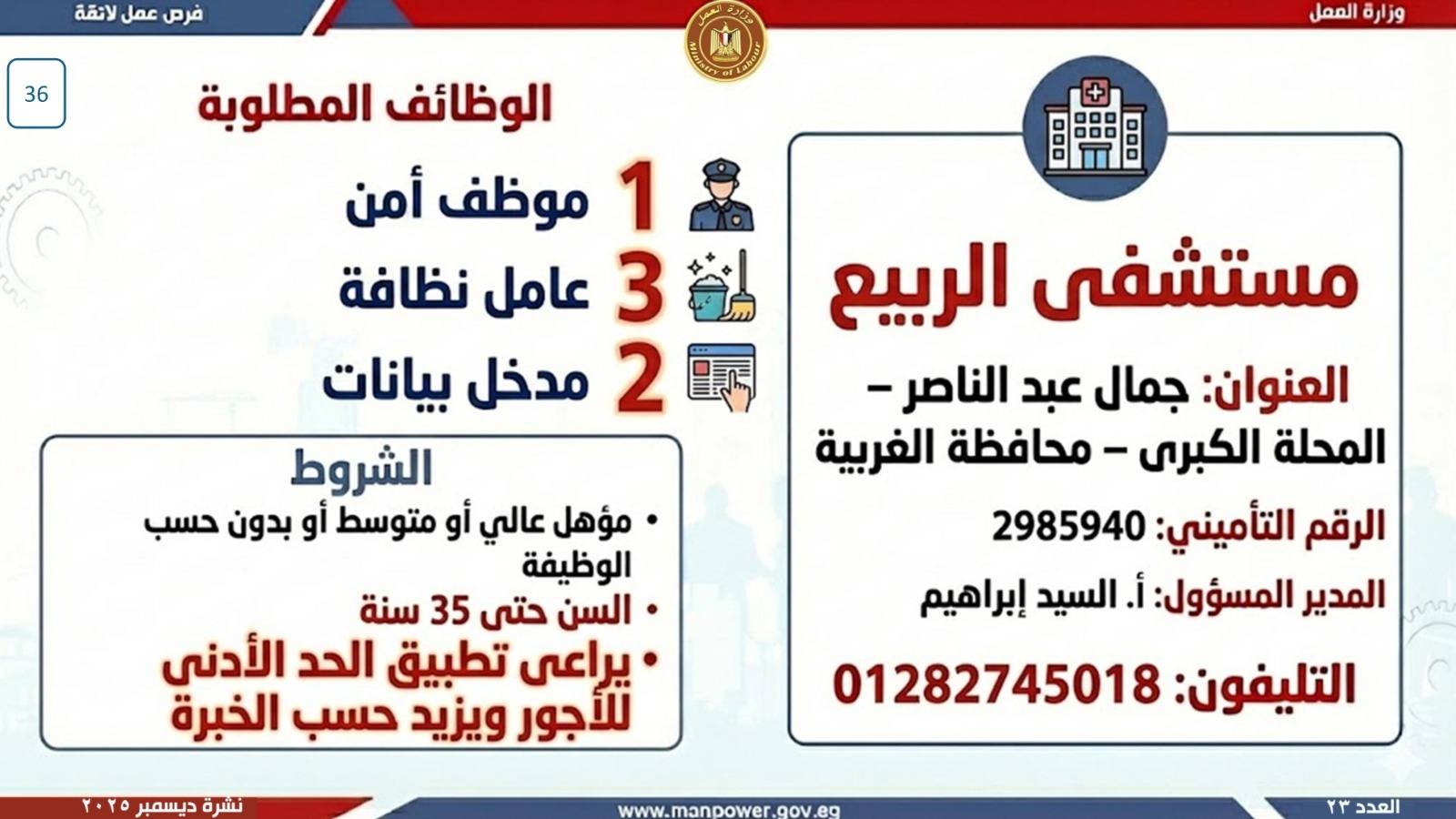 وتتضمن أحدث فرص العمل المتاحة في المحافظات...وأكدت الوزارة أن النشرة تتضمن عددًا من الوظائف المخصصة لذوي الهمم، تنفيذًا لأحكام القانون رقم 10 لسنة 2018 بشأن حقوق الأشخاص ذوي الإعاقة، والذي يُلزم المنشآت بتخصيص نسبة 5% من إجمالي العاملين بها لهذه الف.