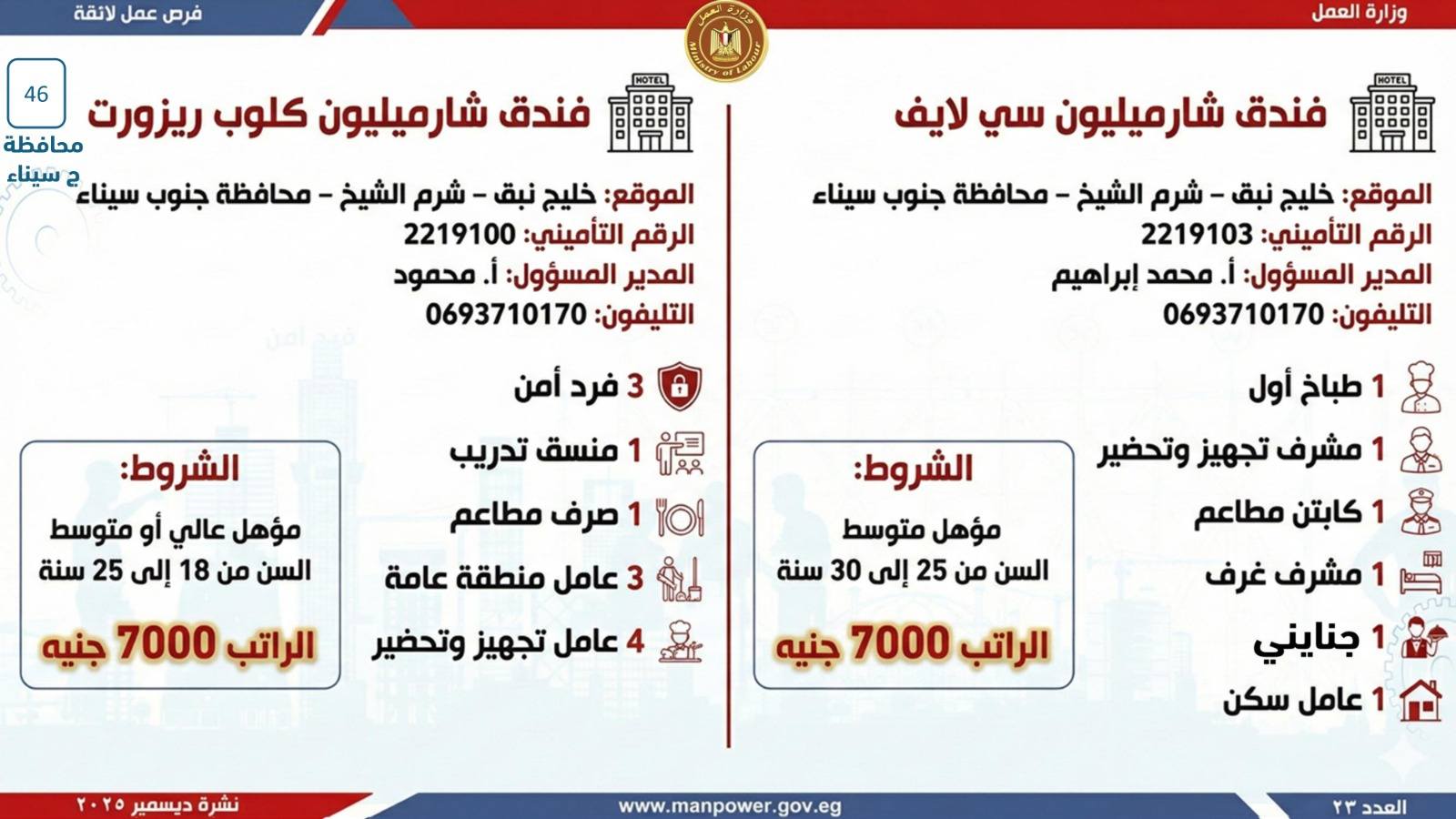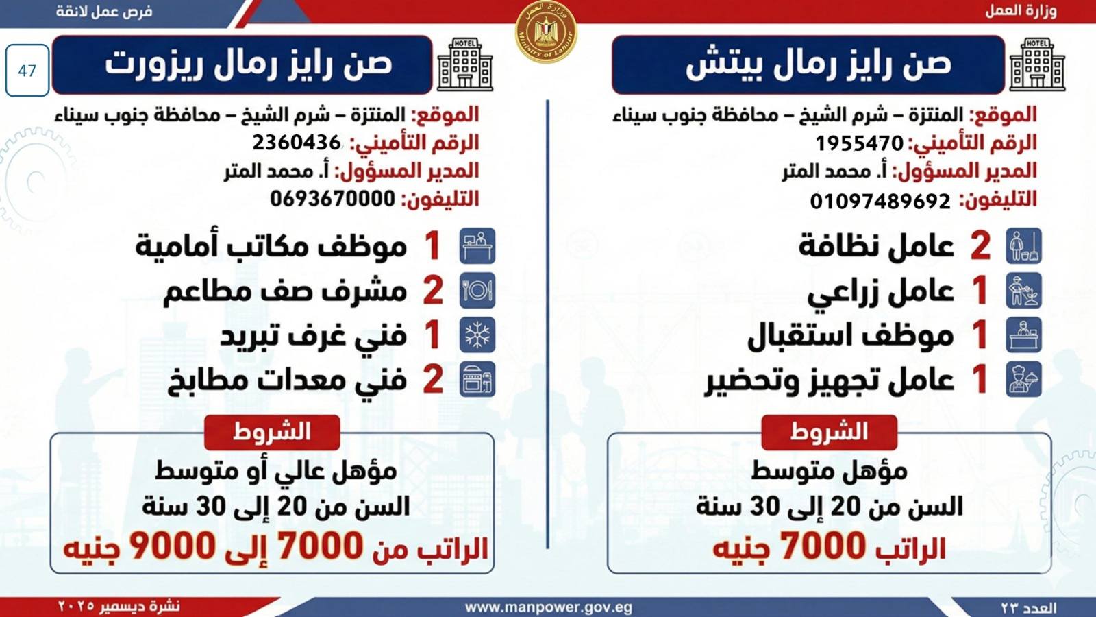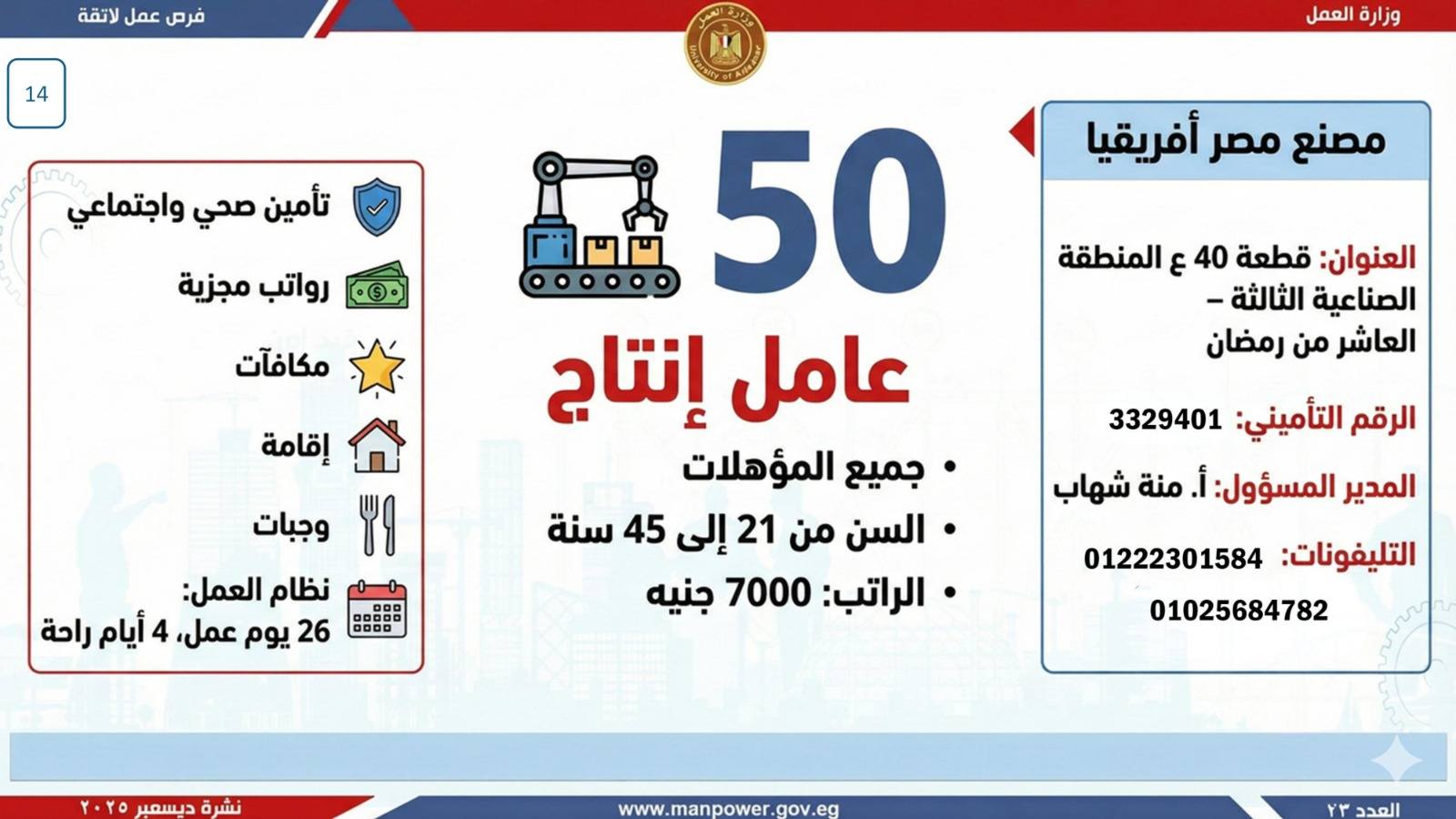 وتشمل النشرة الحالية فرص عمل متاحة في محافظات: القاهرة، الجيزة، القليوبية، الإسكندرية، الغربية، الشرقية، دمياط، المنيا، أسيوط، بني سويف، سوهاج، أسوان، جنوب سيناء.