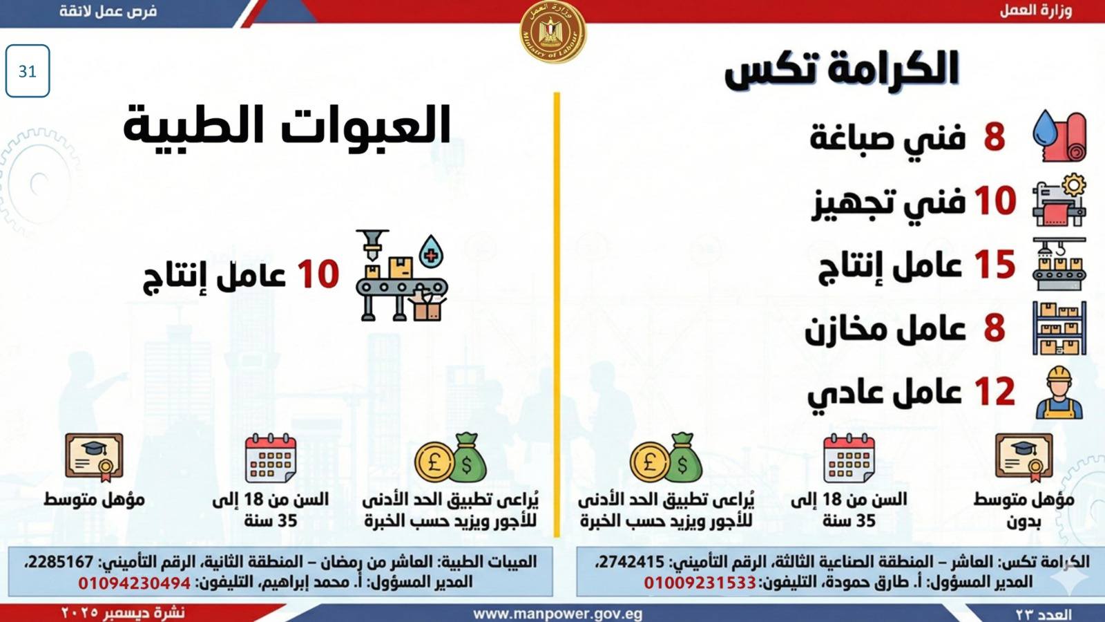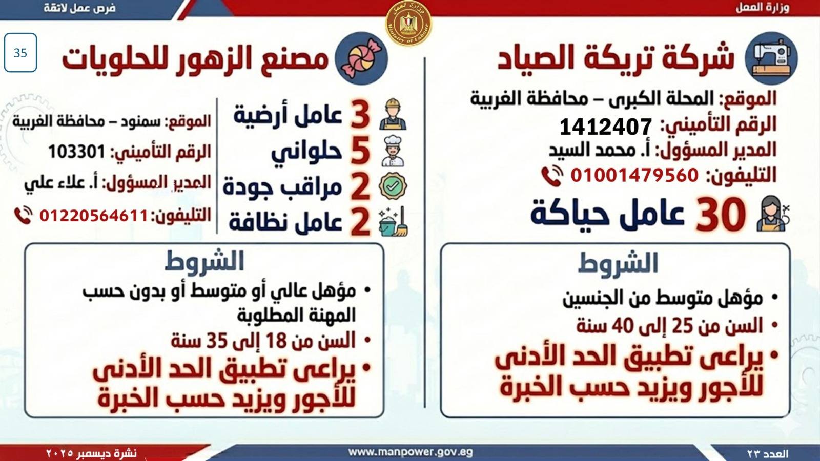 كما يمكن التقديم مباشرة من خلال بيانات الشركات المرفقة بالنشرة، أو عبر الموقع الرسمي لوزارة العمل على شبكة الإنترنت.