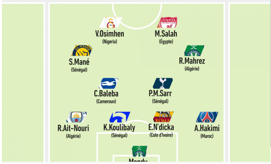 إدوارد ميندي حارس منتخب السنغال ونادي الأهلي السعودي، وأشرف حكيمي مدافع منتخب المغرب ونادي باريس سان جيرمان الفرنسي، وخاليدو كوليبالي مدافع منتخب السنغال ونادي الهلال السعودي، وريان آيت نوري مدافع منتخب الجزائر ونادي مانشستر سيتي الإنجليزي، وإيفان نديكا مدافع منتخب كوت ديفوار ونادي روما الإيطالي.