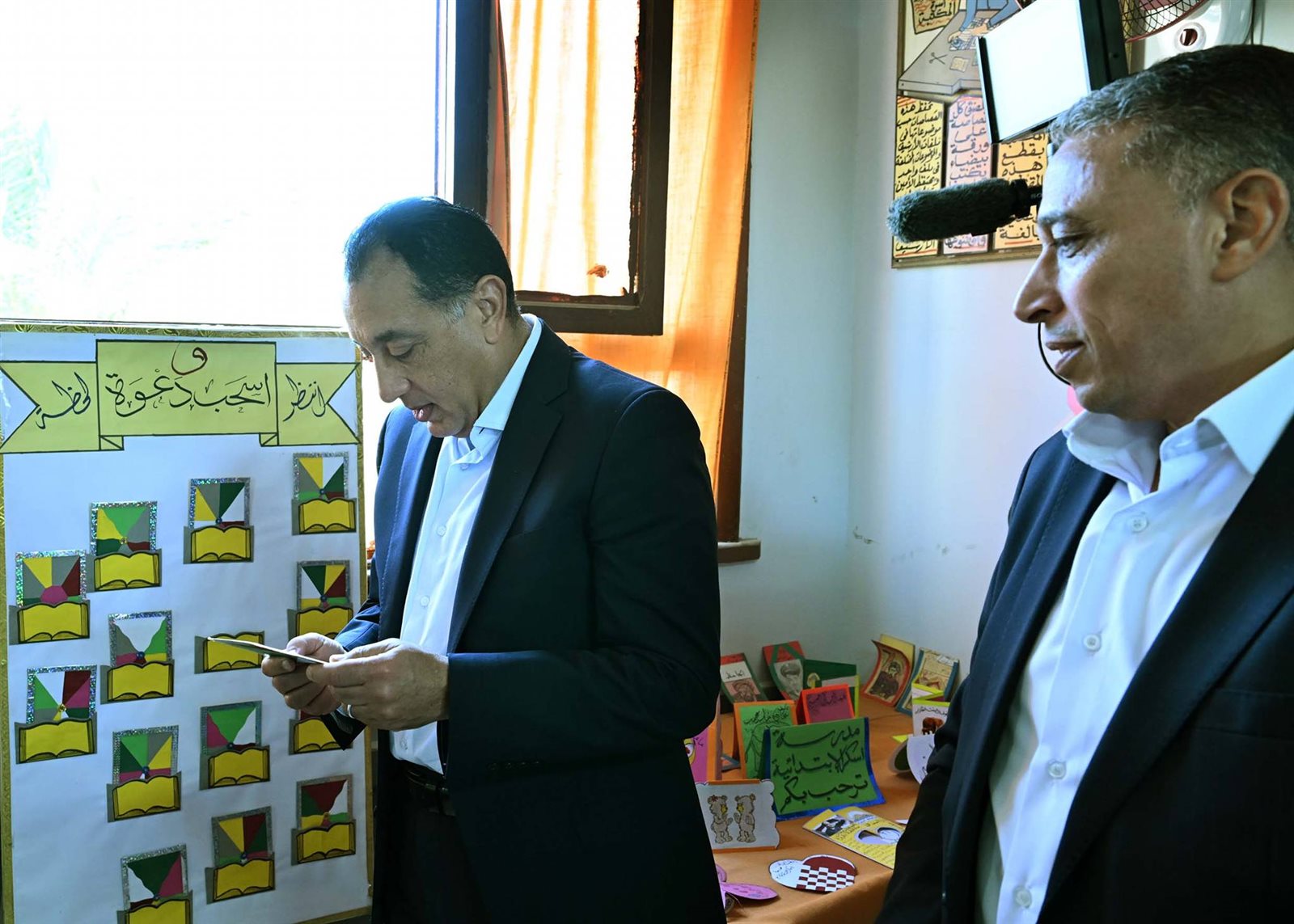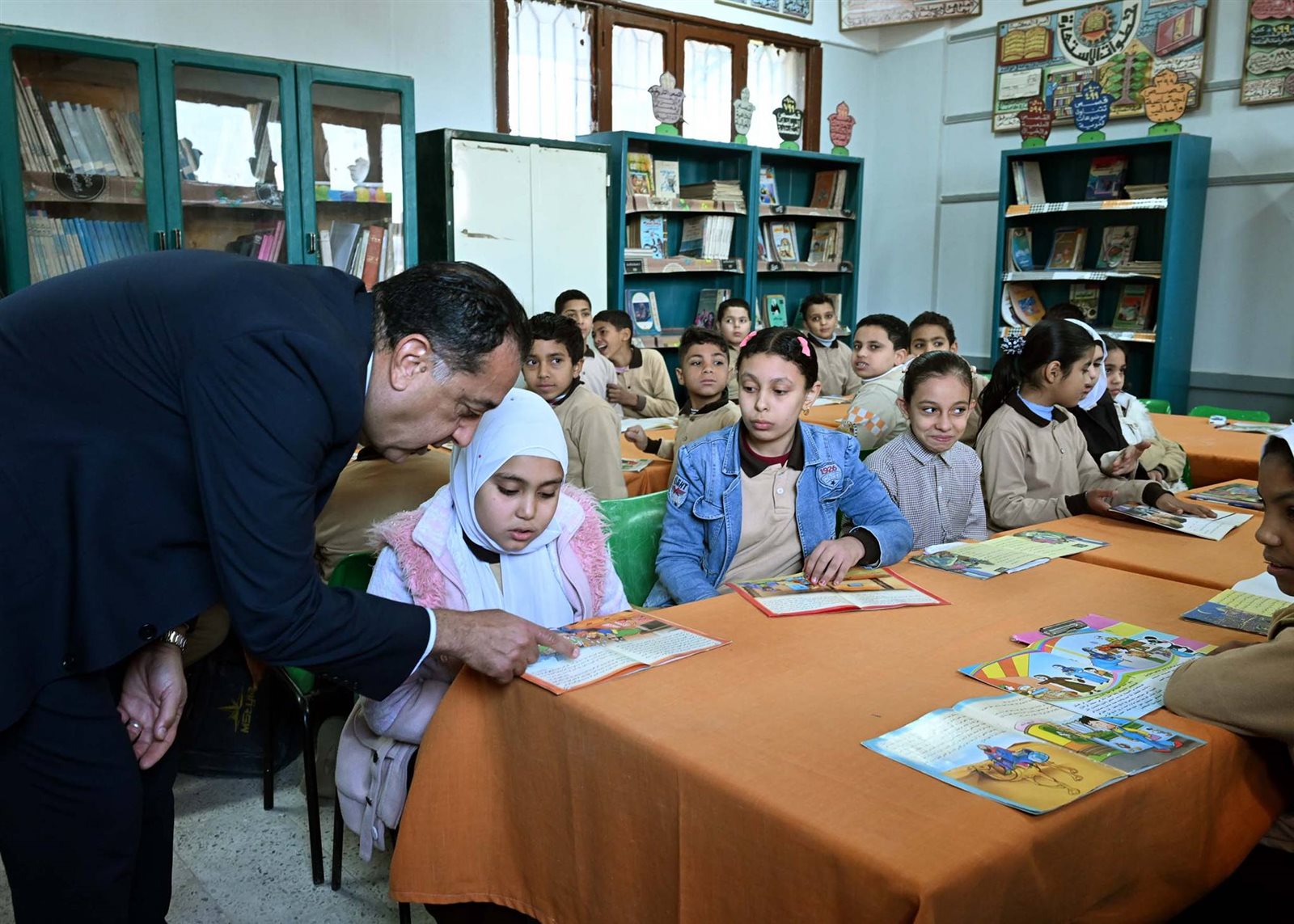 وعقب ذلك، زار الدكتور مصطفى مدبولي مكتبة المدرسة، حيث وقفت إحدى الطالبات لقراءة نص من أحد الكتب الدينية، وأشاد بمستواها، كما توقف أمام لوحة معلقة على حائط المدرسة توضح بعض النصائح والإرشادات للطلاب.