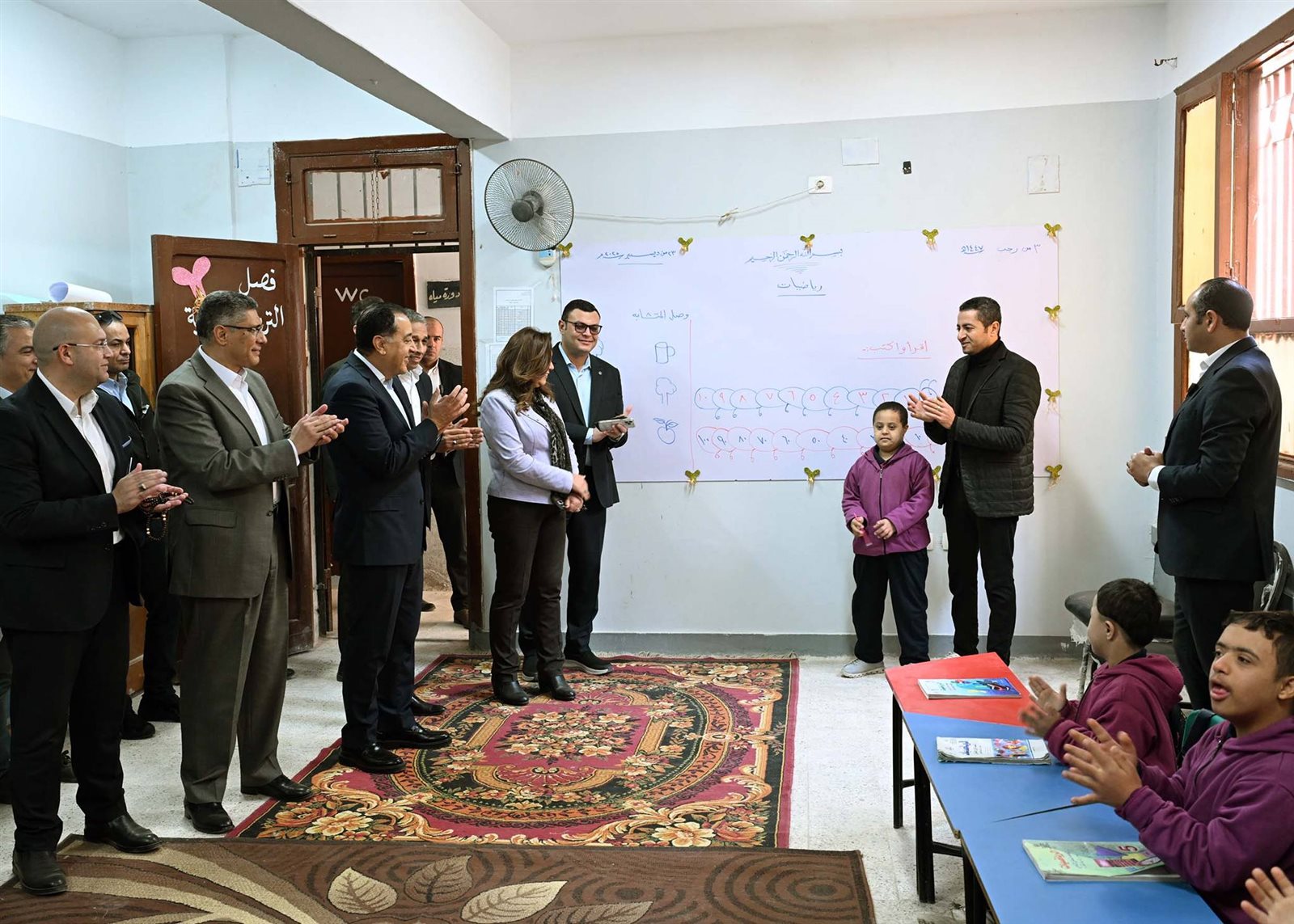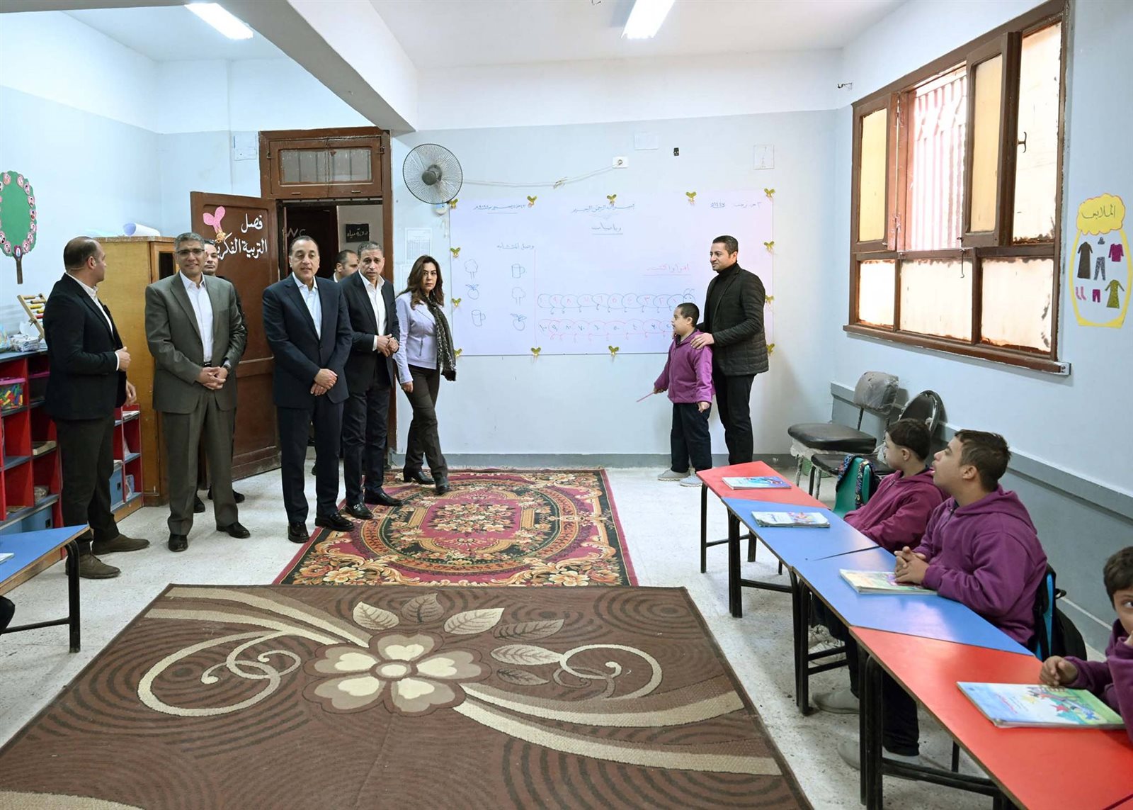 كما تفقد رئيس الوزراء فصل ذوي الهمم، مستمعًا إلى شرح قدمه أحد الطلاب لزملائه عن بعض العمليات الحسابية، مشيدًا به وبزملائه متمنيًا لهم التوفيق والنجاح والتفوق.