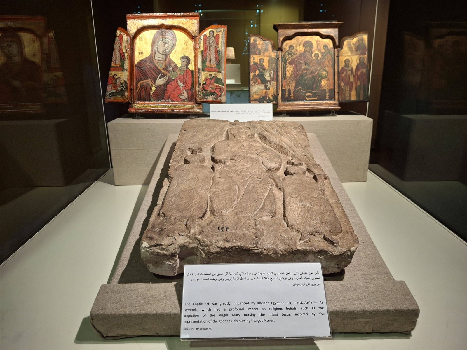 من جانبها، قالت الدكتورة نشوى جابر، نائب الرئيس التنفيذي للشئون الأثرية، إن المعرض يضم مجموعة متميزة ونادرة من روائع الفن القبطي تُعرض لأول مرة، تشمل أيقونات ومخطوطات قبطية ومشغولات فنية كانت تُستخدم في الأديرة والكنائس، من أبرزها أيقونة لميلاد السيدة العذراء، ومنظر حجري يُجسّدها وهي ترضع السيد المسيح، بما يعكس ثراء هذا التراث وقيمته الفنية والرمزية.