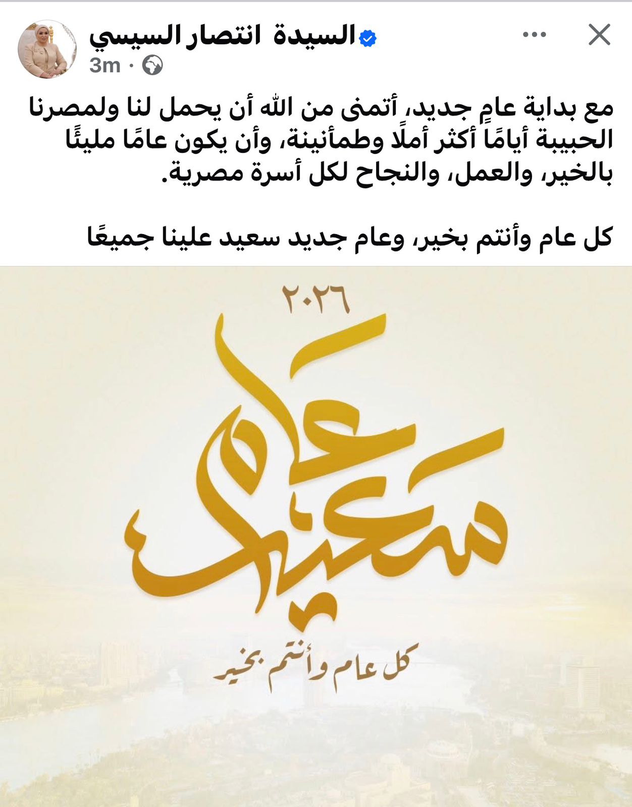 وقالت السيدة انتصار السيسي، عبر حساباتها الرسمية على مواقع التواصل الاجتماعي: “مع بداية عامٍ جديد، أتمنى من الله أن يحمل لنا ولمصرنا الحبيبة أيامًا أكثر أملًا وطمأنينة، وأن يكون عامًا مليئًا بالخير، والعمل، والنجاح لكل أسرة مصرية”.