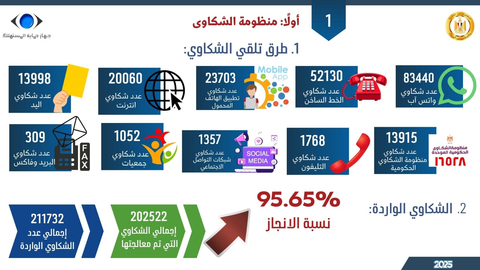 تلقى جهاز حماية المستهلك خلال عام 2025 عدد 211,732 شكوى من المواطنين عبر مختلف قطاعات الشكاوى، حيث جاء نصيب الإدارات المركزية بالقاهرة الكبرى بإجمالي 107,555 شكوى، بينما سجلت الأفرع الإقليمية للجهاز 104,177 شكوى. وجاءت شكاوى السلع المعمرة والأجهزة الكهربائية في الصدارة بعدد 32,384 شكوى، تلتها شكاوى الاتصالات وأجهزة المحمول بعدد 18,726 شكوى، ثم شكاوى التسوق الإلكتروني والإعلانات المُضللة بعدد 14,405 شكوى، فيما سجلت شكاوى الخدمات والمرافق عدد 11,214 شكوى، وشكاوى السلع المتنوعة عدد 10,817 شكوى، وشكاوى التحريات 8,019 شكوى، تلتها شكاوى الأثاث والعقارات والمهمات بعدد 6,053 شكوى، وأخيرًا شكاوى السيارات بعدد 5,638 شكوى.
