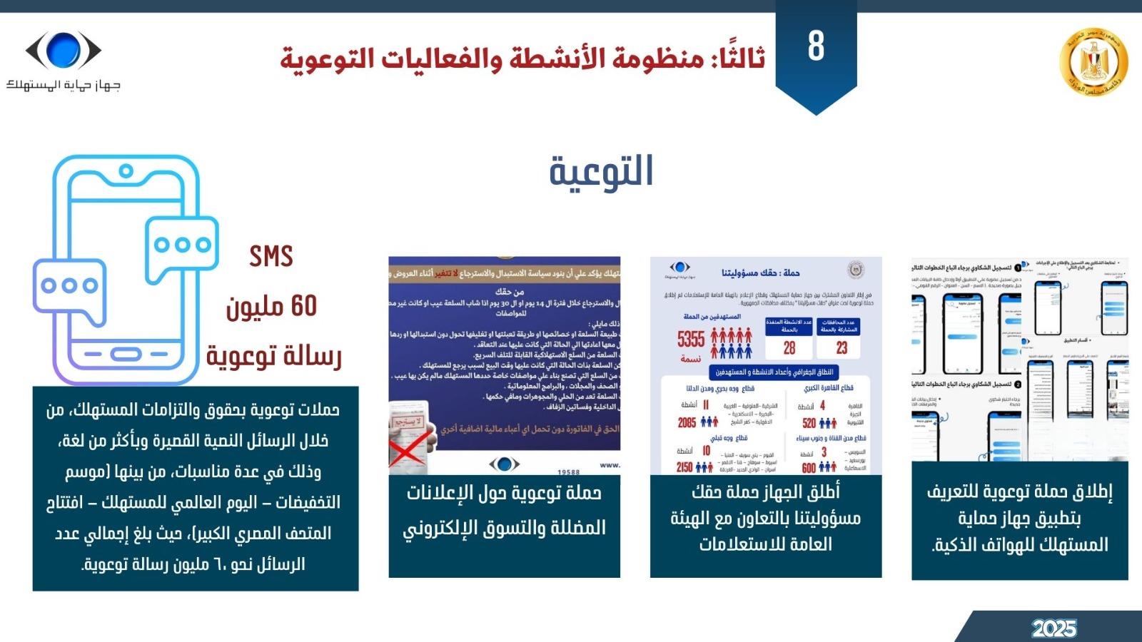 كما نفّذ الجهاز حملات توعوية بحقوق والتزامات المستهلك وفقًا لأحكام القانون، من خلال الرسائل النصية القصيرة وبأكثر من لغة، في عدد من المناسبات، من بينها مواسم التخفيضات، واليوم العالمي للمستهلك، وافتتاح المتحف المصري الكبير، حيث بلغ إجمالي عدد الرسائل التوعوية نحو 60 مليون رسالة.