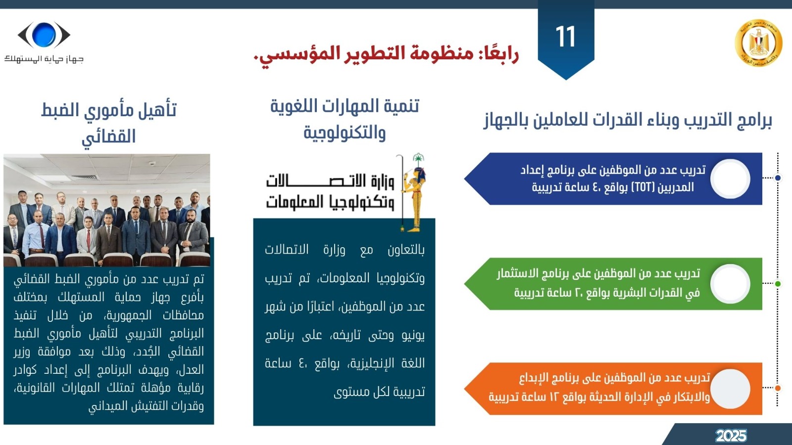 انطلاقًا من إيمان جهاز حماية المستهلك بأهمية التطوير المؤسسي وبناء القدرات كركيزة أساسية لتحسين كفاءة الأداء وتعزيز جودة الخدمات المقدمة للمواطنين، واصل الجهاز خلال عام 2025 تنفيذ خطة متكاملة تستهدف الاستثمار في العنصر البشري، وتحديث البنية التحتية الإدارية والفنية، ودعم التحول الرقمي، بما يواكب توجهات الدولة نحو بناء جهاز إداري كفء وفعّال.