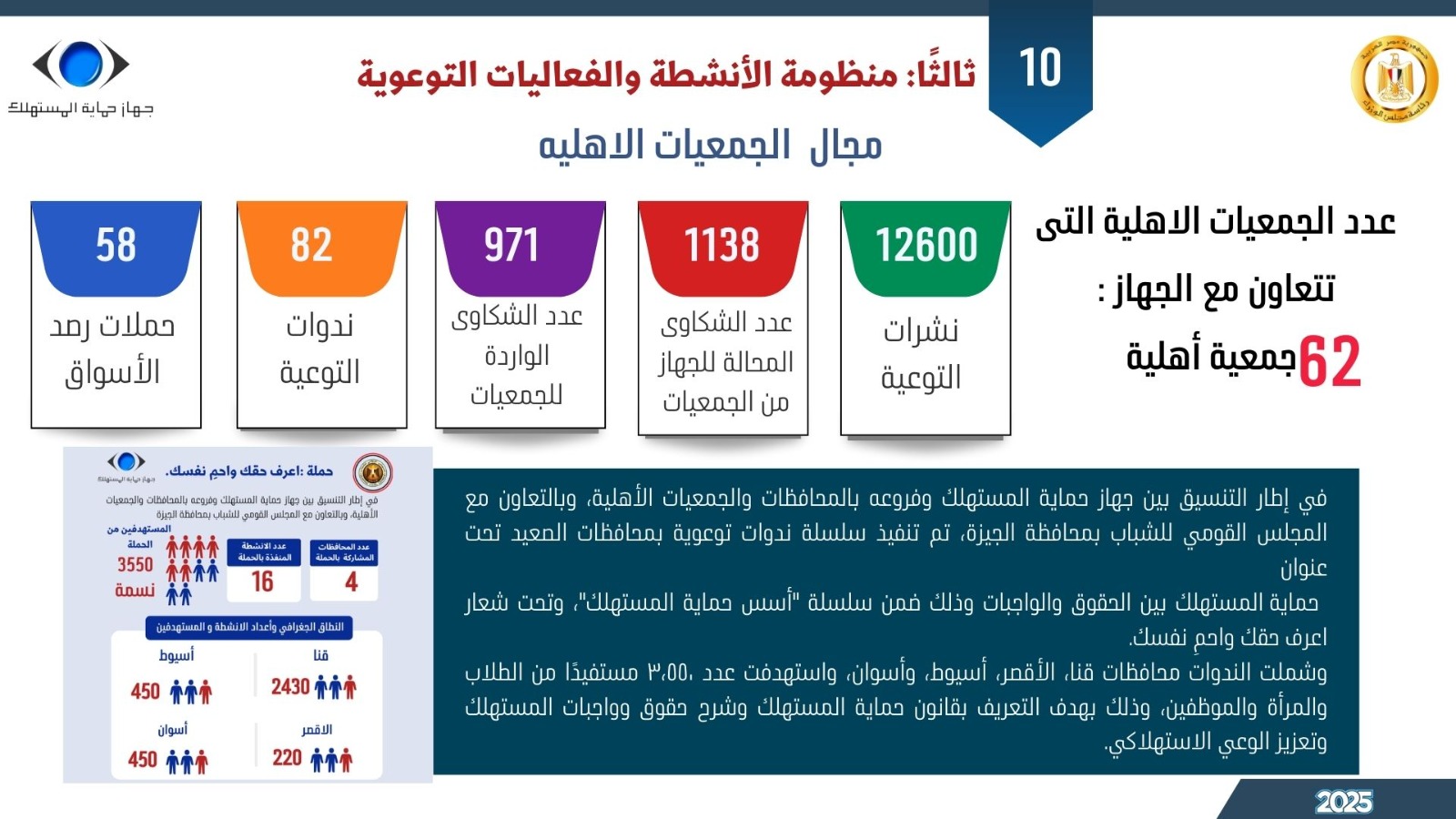 وفي مجال التعاون مع منظمات المجتمع المدني، واصلت الجمعيات الأهلية المتعاونة مع جهاز حماية المستهلك، والبالغ عددها 62 جمعية أهلية، تنفيذ ندوات وحملات توعوية لرصد المخالفات بالأسواق، ونشر ثقافة حماية المستهلك، إلى جانب تلقي شكاوى المواطنين والعمل على حلها أو إحالة ما تم رصده منها إلى جهاز حماية المستهلك، حيث بلغ عدد الشكاوى المُحالة للجهاز 1138 شكوى لاتخاذ الإجراءات اللازمة حيالها.