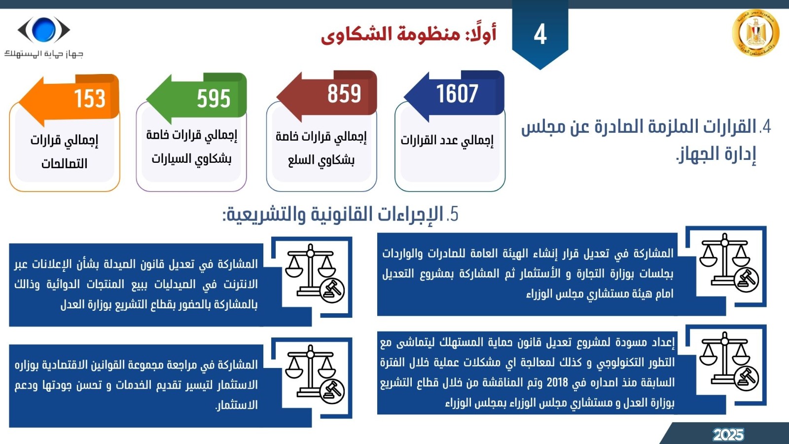 وعلى صعيد القرارات الملزمة الصادرة عن مجلس إدارة الجهاز، فقد أصدر المجلس خلال عام 2025 عدد 1,607 قرارًا ملزمًا ضد الشركات غير المتعاونة في حل شكاوى المواطنين، وذلك في إطار صلاحياته القانونية لضبط منظومة تقديم السلع والخدمات، وإزالة أسباب المخالفات وتصحيح الأوضاع ورد الحقوق لأصحابها، بما يسهم في سرعة الفصل في الشكاوى وتعزيز الانضباط والعدالة وحماية حقوق المستهلكين، ويعكس التزام الجهاز باللوائح والقوانين المنظمة للأسواق وترسيخ الثقة بين المستهلك ومقدمي الخدمات.