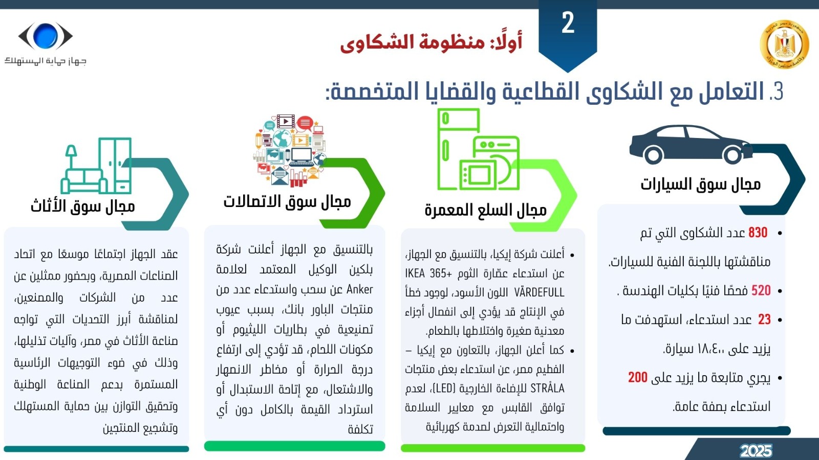 في إطار تطوير منظومة التعامل مع الشكاوى المتخصصة وتعزيز آليات الفحص الفني والقانوني، واصل جهاز حماية المستهلك خلال عام 2025 جهوده في التعامل مع الشكاوى القطاعية وفقًا لطبيعة كل قطاع، بما يضمن سرعة الفصل وحماية حقوق المستهلكين.