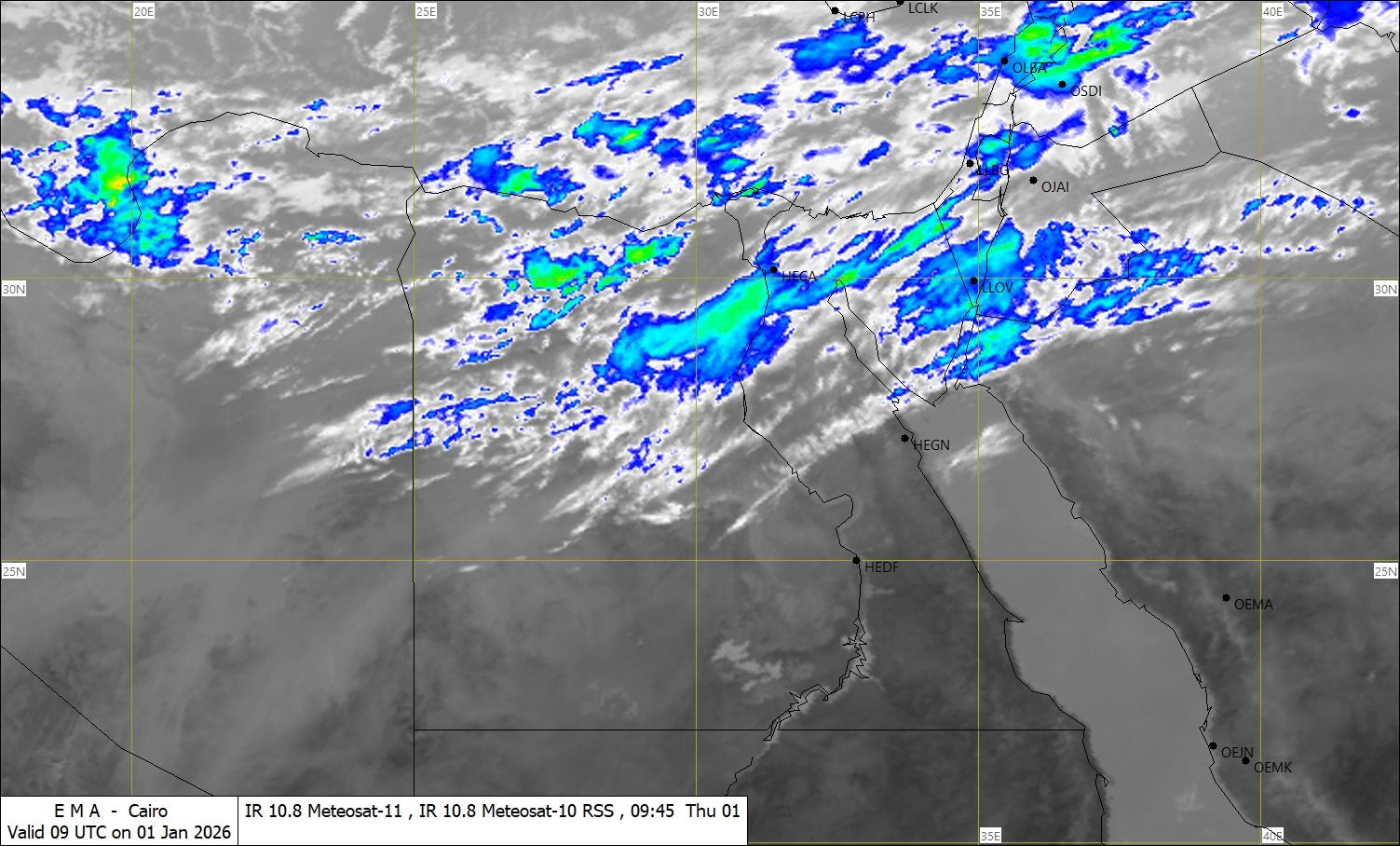 تشير آخر صور صور الأقمار الصناعية استمرار وجود سحب منخفضة ممطرة على مناطق متفرقة من محافظة مطروح والصحراء الغربية، ومن المتوقع مع تقدم الوقت أن تمتد هذه السحب إلى مناطق من باقي السواحل الشمالية وشمال الوجه البحري يصاحبها سقوط أمطار متفاوتة الشدة.