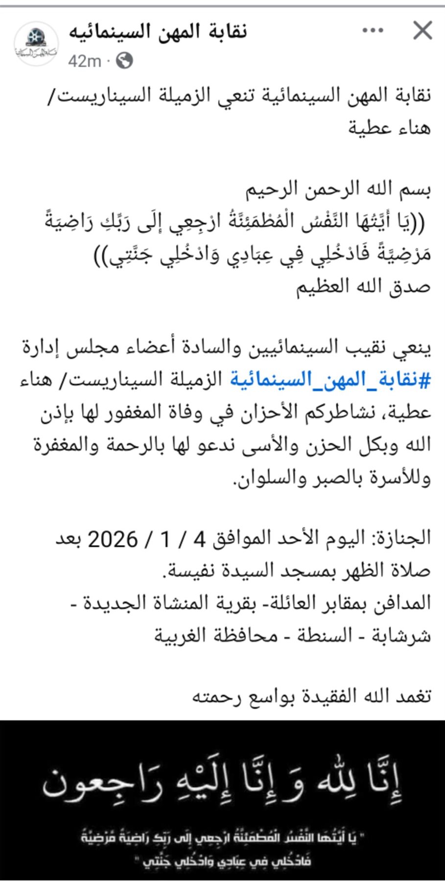 ينعي نقيب السينمائيين والسادة أعضاء مجلس إدارة نقابة المهن السينمائية الزميلة السيناريست هناء عطية، نشاطركم الأحزان في وفاة المغفور لها بإذن الله وبكل الحزن والأسى ندعو لها بالرحمة والمغفرة وللأسرة بالصبر والسلوان.