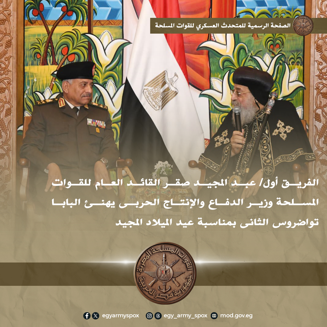 قام الفريق أول عبدالمجيد صقر القائد العام للقوات المسلحة وزير الدفاع والإنتاج الحربى يرافقه الفريق أحمد خليفة رئيس أركان حرب القوات المسلحة وقادة الأفرع الرئيسية وعدد من قادة القوات المسلحة بتقديم التهنئة لقداسة البابا تواضروس الثاني بابا الإسكندرية وبطريرك الكرازة المرقسية بمناسبة عيد الميلاد المجيد وذلك بمقر الكاتدرائية المرقسية بالعباسية.