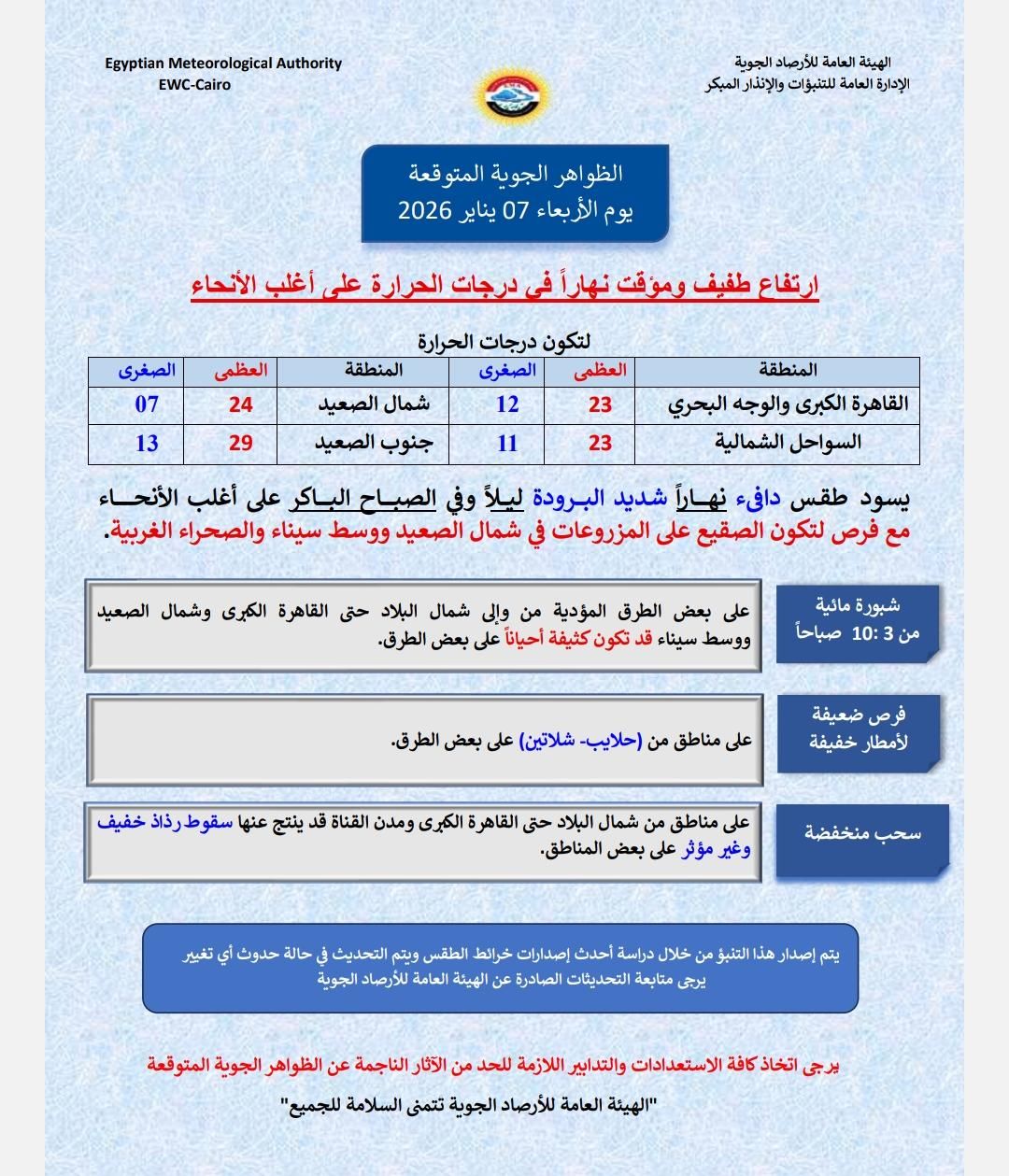 تتوقع الهيئة العامة للأرصاد الجوية، أن يشهد غدًا الأربعاء 7- 1- 2026، ارتفاعا طفيفا ومؤقتا نهاراً في درجات الحرارة على أغلب الأنحاء، ليسود طقس شديد البرودة في الصباح الباكر، دافئ نهاراً شديد البرودة ليلاً وفي الصباح الباكر، مع فرص لتكون الصقيع علي المزروعات في شمال الصعيد ووسط سيناء والصحراء الغربية.