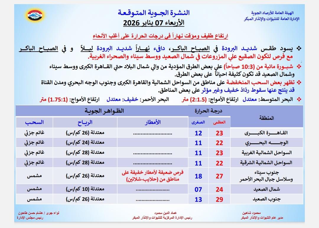 كشفت الهيئة العامة للأرصاد الجوية عن تغيرات مفاجئة في حالة الطقس المتوقعة على كافة محافظات الجمهورية اليوم الأربعاء 7 يناير 2026.