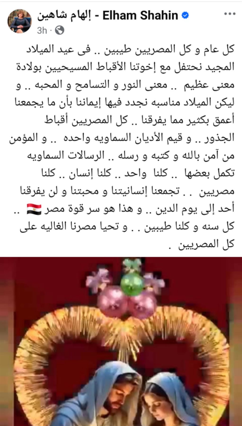 ونشرت الفنانة إلهام شاهين على صفحتها الشخصية على موقع التواصل الاجتماعي "فيسبوك"، منشور لها لتشارك به جمهورها: "كل عام وكل المصريين طيبين، في عيد الميلاد المجيد نحتفل مع إخوتنا الأقباط المسيحيين بولادة معنى عظيم، معنى النور والتسامح والمحبة، وليكن الميلاد مناسبة نجدد فيها إيماننا بأن ما يجمعنا أعمق بكثير مما يفرقنا.