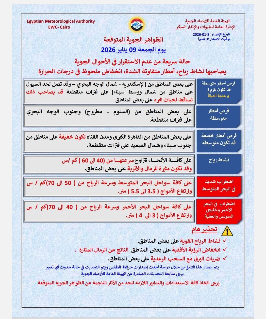 كما تشير التوقعات إلى نشاط رياح على كافة الأنحاء قد تكون مثيرة للرمال والأتربة على بعض المناطق، مع فرص أمطار متوسطة قد تكون غزيرة أحيانآ ورعدية أحيانآ على مناطق من الأسكندرية وشمال الوجه البحرى و شمال وسط سيناء، وفرص أمطار متوسطة على مناطق من السلوم و مطروح وجنوب الوجه البحرى، وفرص أمطار خفيفة قد تكون متوسطه على مناطق من القاهرة الكبرى ومدن القناة تكون خفيفة على مناطق من جنوب سيناء وشمال الصعيد.