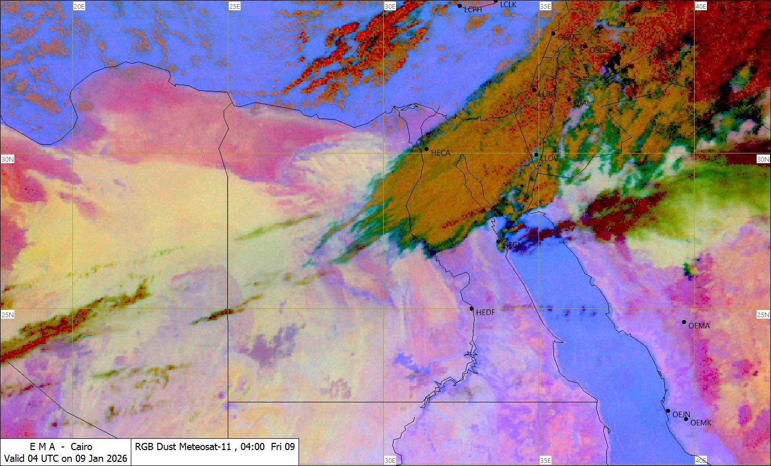 وبالنسبة لخليج السويس والعقبة تكون مضطرب وارتفاع الموج فيه من 2.5 الى 3.5 متر والرياح السطحية شمالية غربية.