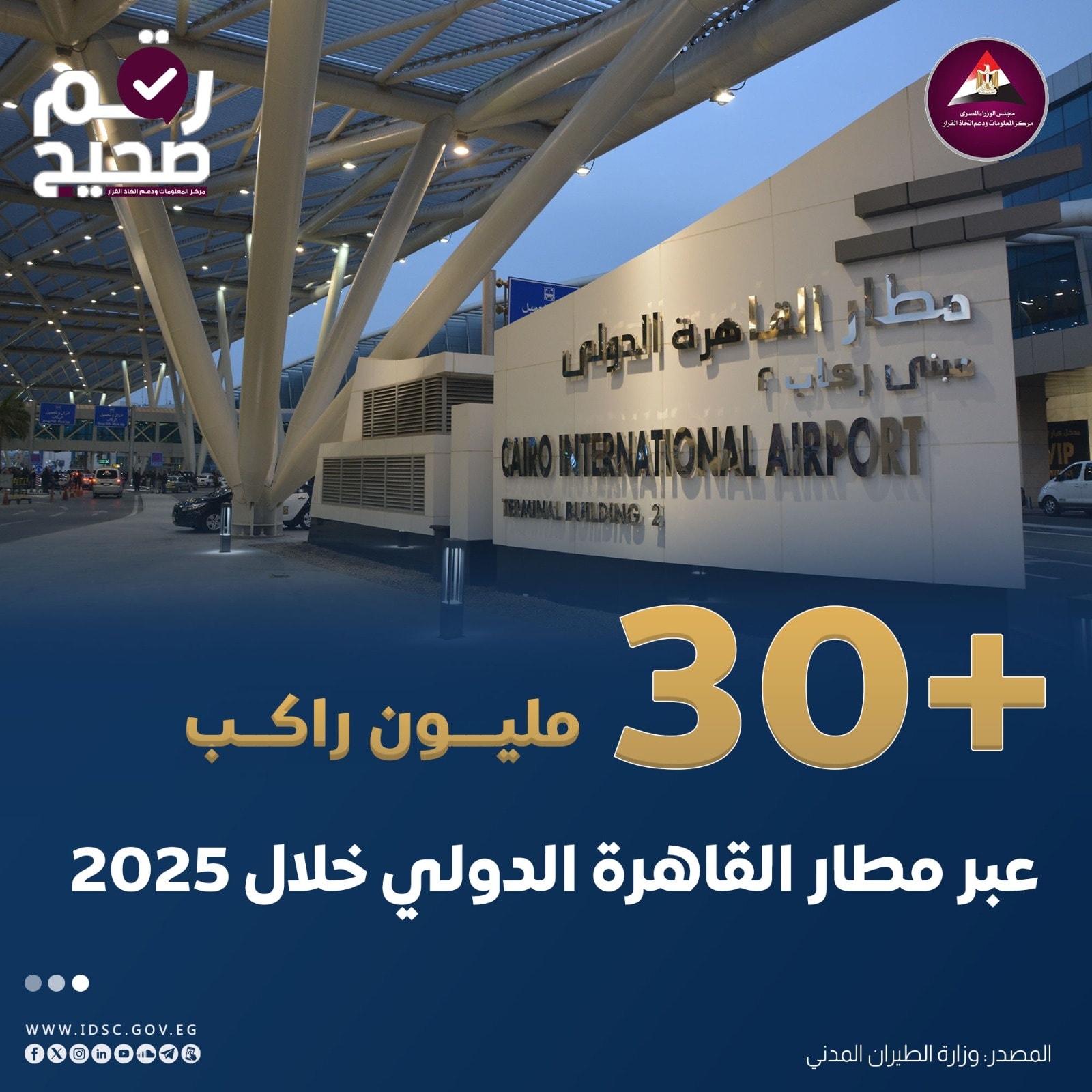 كشف مركز المعلومات ودعم اتخاذ القرار التابع لرئاسة مجلس الوزراء، أن مطار القاهرة الدولي استقبل نحو 30.944.269 راكبًا خلال عام 2025، ليسجل زيادة بلغت 6.8% مقارنة بعام 2024 الذي سجل 28.974.544 راكبًا.